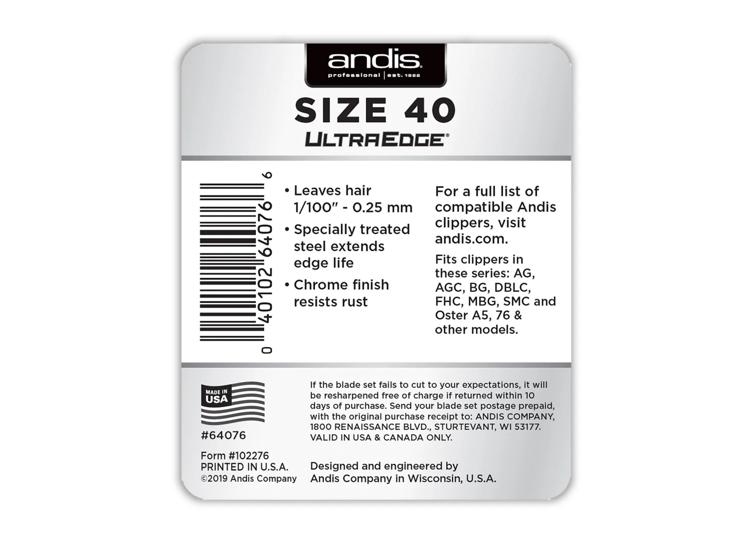 Made from hardened, finest grade tool steel, Andis have added carbon to the cutting edge, to create these unique Ultra Edge professional blades. These blades are ice tempered to stay sharper longer and are chrome plated to resist rust. Compatible with all Andis, Double K, Laube, Moser, Oster and Wahl professional clippers. The new 19mm model is the largest blade of its kind.