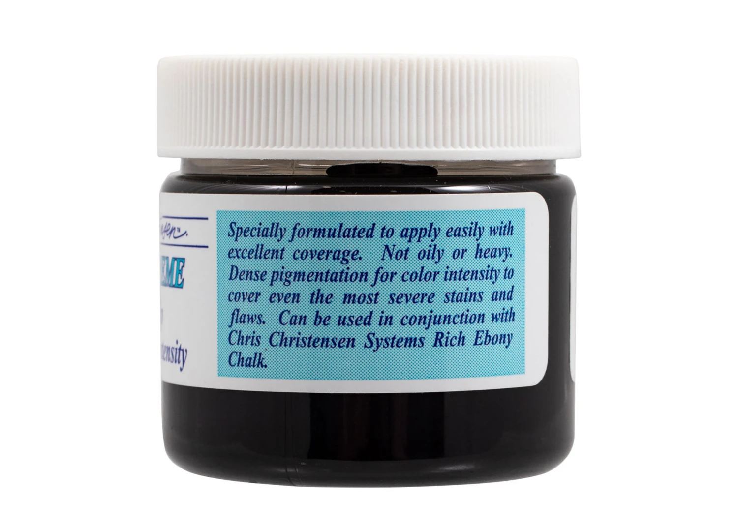 Black Ice Creme has been formulated to apply easily and afford excellent coverage without being oily or heavy. It contains dense pigmentation for color intensity to cover even the most severe stains and flaws. It may be used in conjunction with Chris Christensen Systems Rich Ebony Chalk.