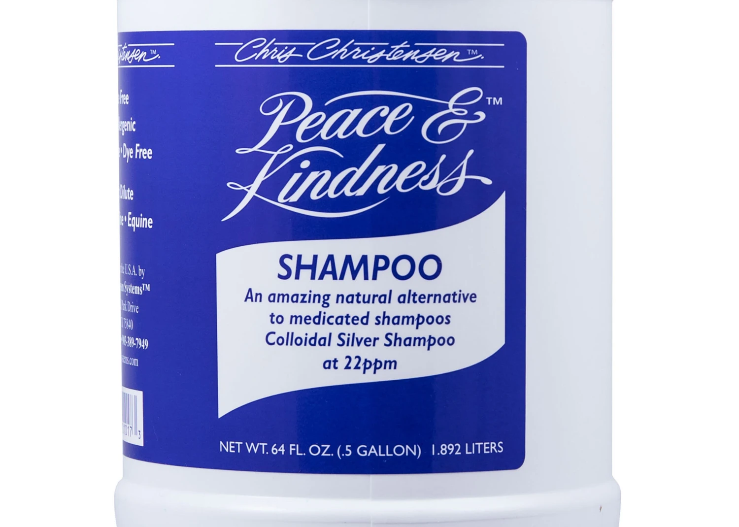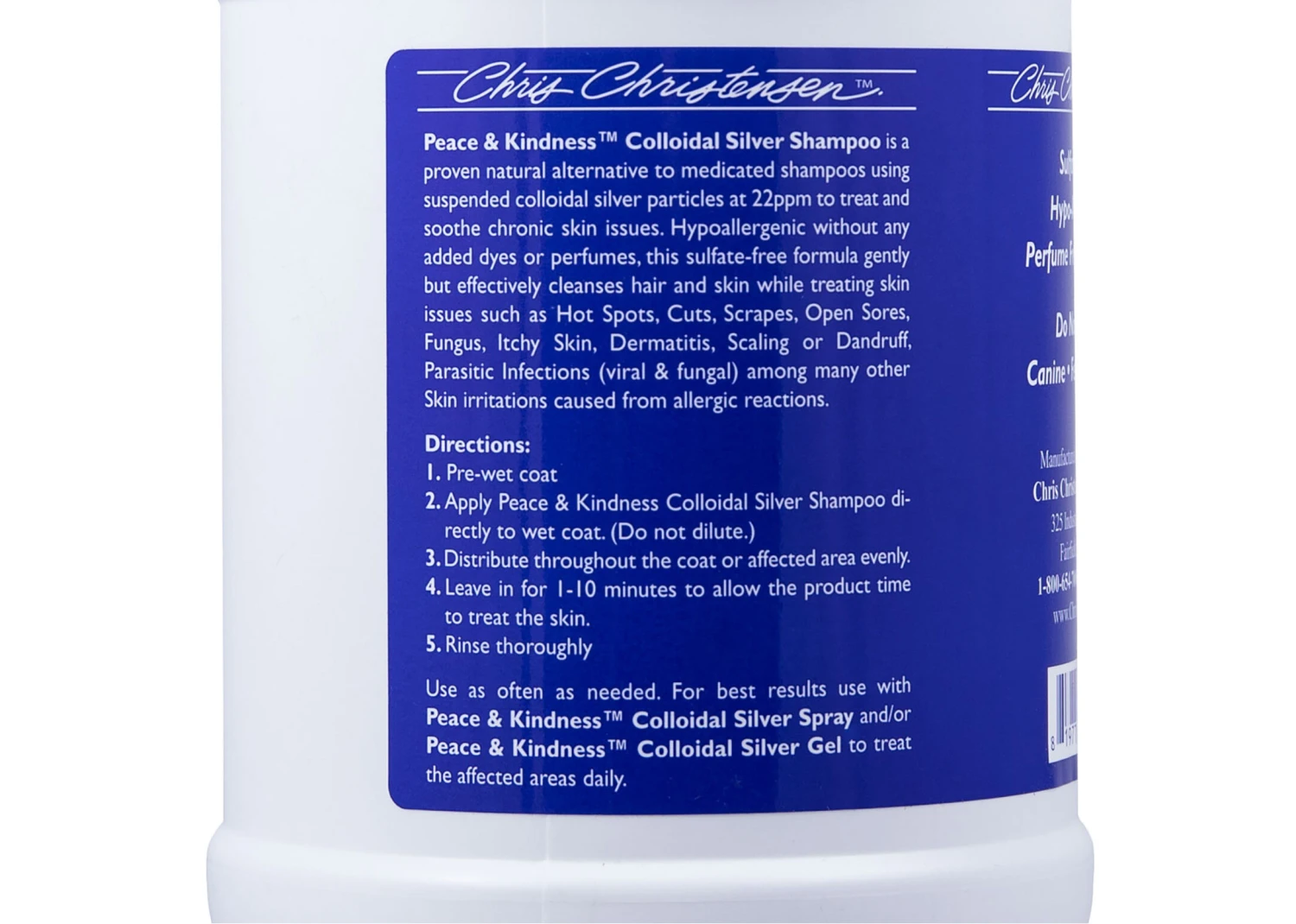 Chris Christensen Peace and Kindness Shampoo is the all-natural, highly effective alternative to medicated shampoos that leaves your pet’s coat soft and smooth. Developed with premium ingredients and the latest in science, this exclusive shampoo contains .999 pure colloidal silver particles at 22ppm to soothe and treat acute and chronic skin conditions. It offers superior results for itchy skin, hot spots, dandruff, yeast infections, parasitic infections, ear infections, fungal infections, allergic reactions, and many more common skin irritations.Â
