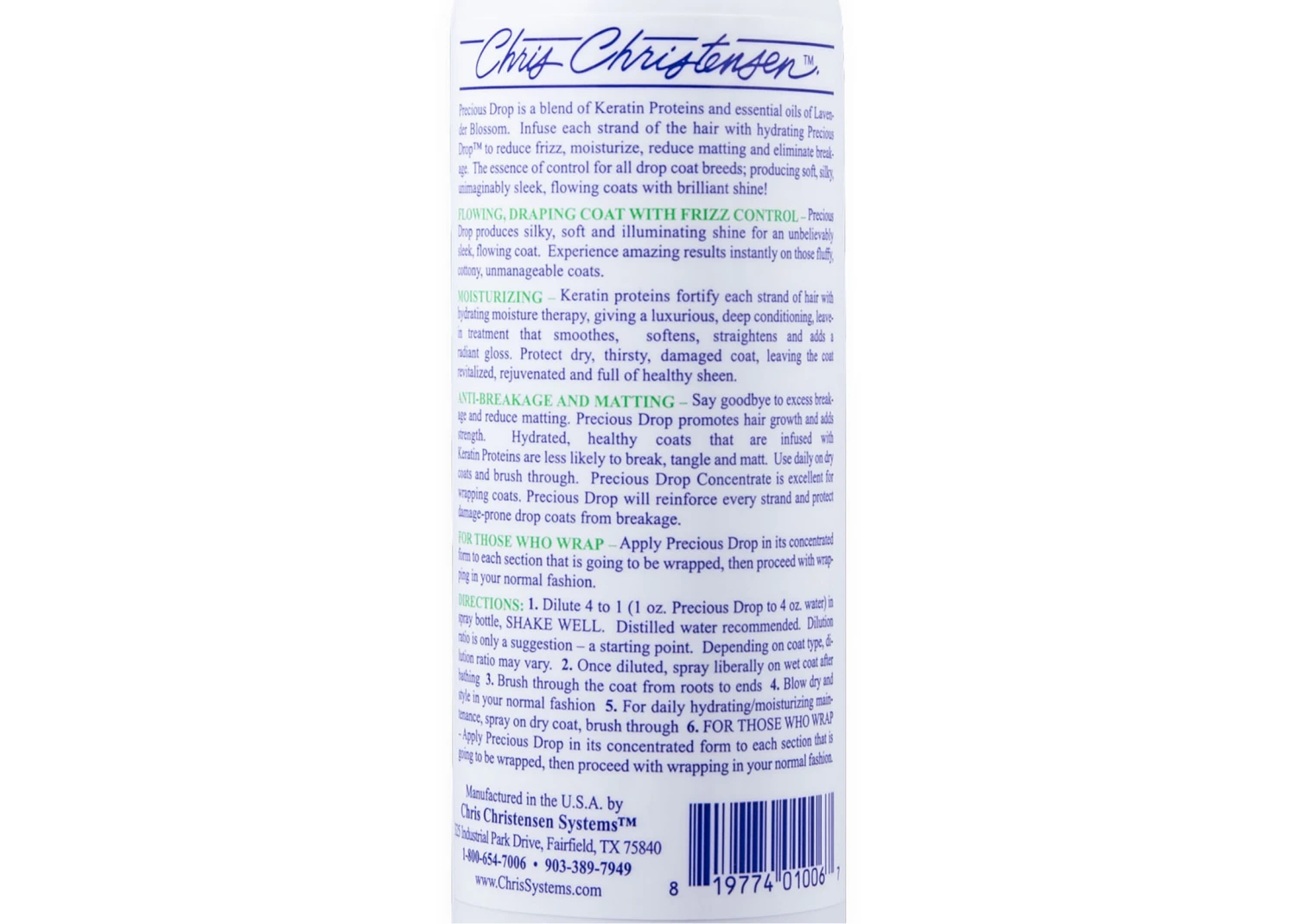 Precious Drop is a blend of Keratin Proteins and essential oils of Lavender Blossom. Infuse each strand of the hair with hydrating Precious Dropâ„¢ to reduce frizz, moisturize, reduce matting and eliminate breakage. The essence of control for all silky, unimaginably sleek, flowing coats with brilliant shine!drop coat breeds; producing soft, silky, unimaginably sleek, flowing coats with brilliant shine!