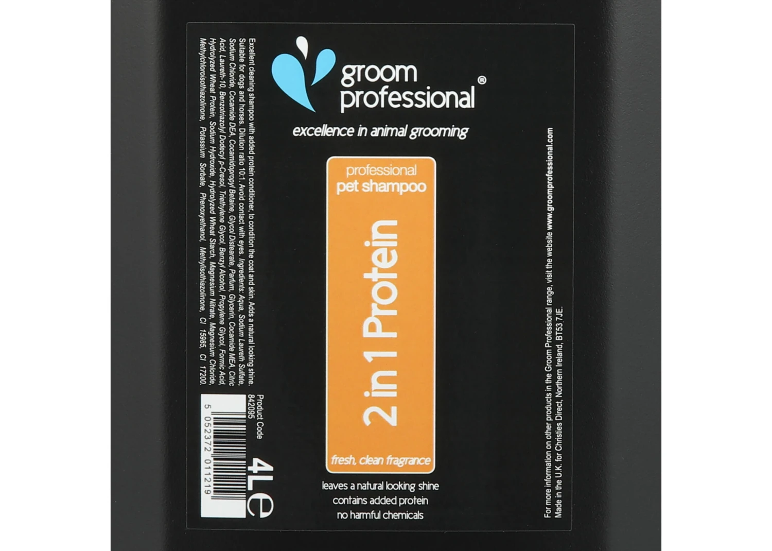 Groom Professional`s 2-in-1 Dog Shampoo is a pH balanced, tearless shampoo that cleans and conditions your dog’s coat in one easy step. The formula features a conditioning agent that helps to restore the natural oils lost during bathing, leaving your dog’s coat soft, shiny, and smelling great. This shampoo is safe for use on all types of coats. Simply lather up your dog with this dilited shampoo, rinse thoroughly, and dry your dog. Your dog will love being clean and conditioned with Groom Professional’s 2-in-1 Dog Shampoo!