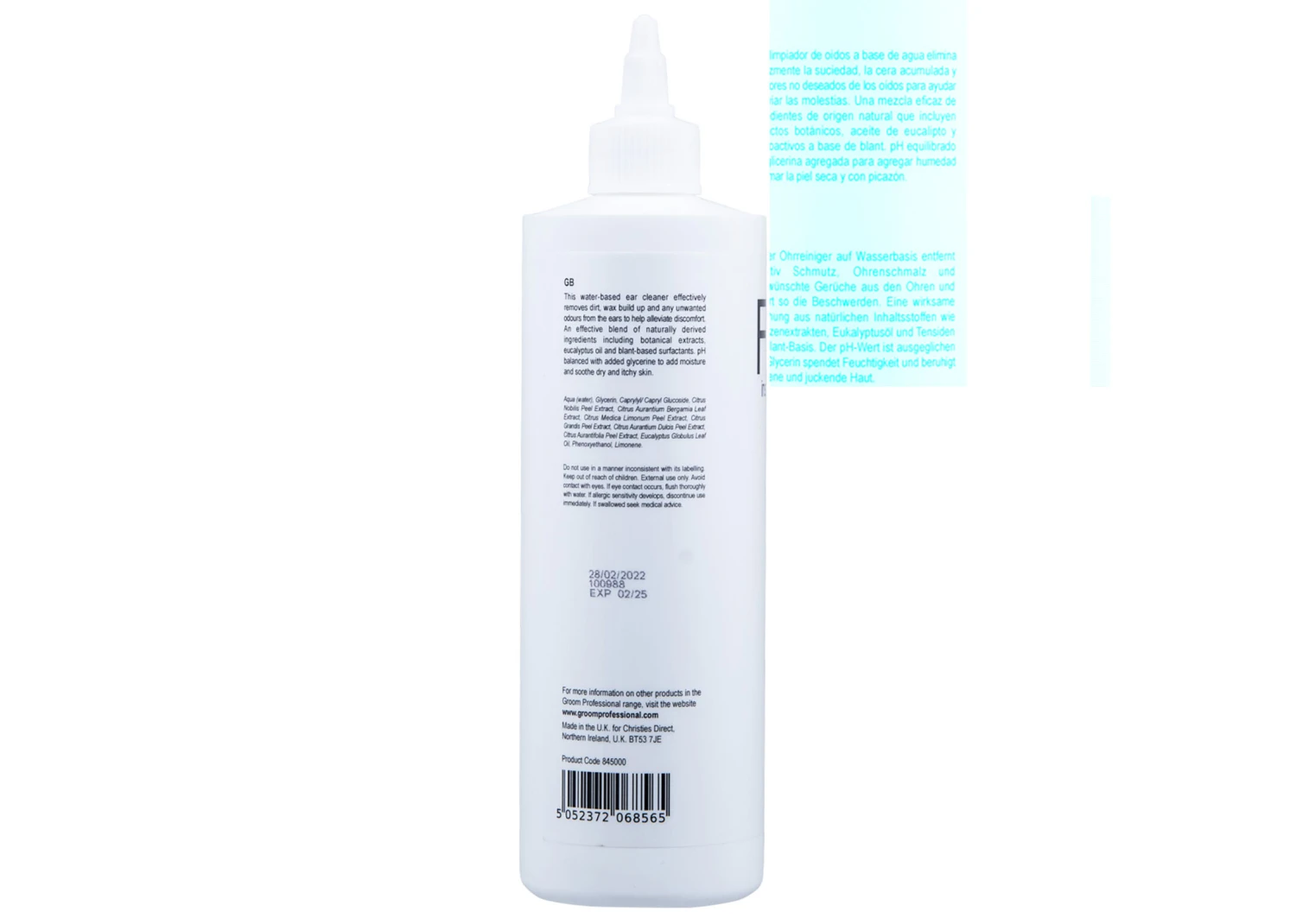 This water-based ear cleaner effectively removes dirt, wax build-up and any unwanted odors from dogs’ ears to help alleviate discomfort. Our ear cleaner is made with a blend of naturally derived ingredients, including botanical extracts, eucalyptus oil and plant-based surfactants. Groom Professional Fresh Ear Cleaner is pH balanced with added glycerin to add moisture and soothe dry and itchy skin. Plus, our ear cleaner has a pleasant eucalyptus fragrance that will leave your dog’s ears smelling fresh and clean.