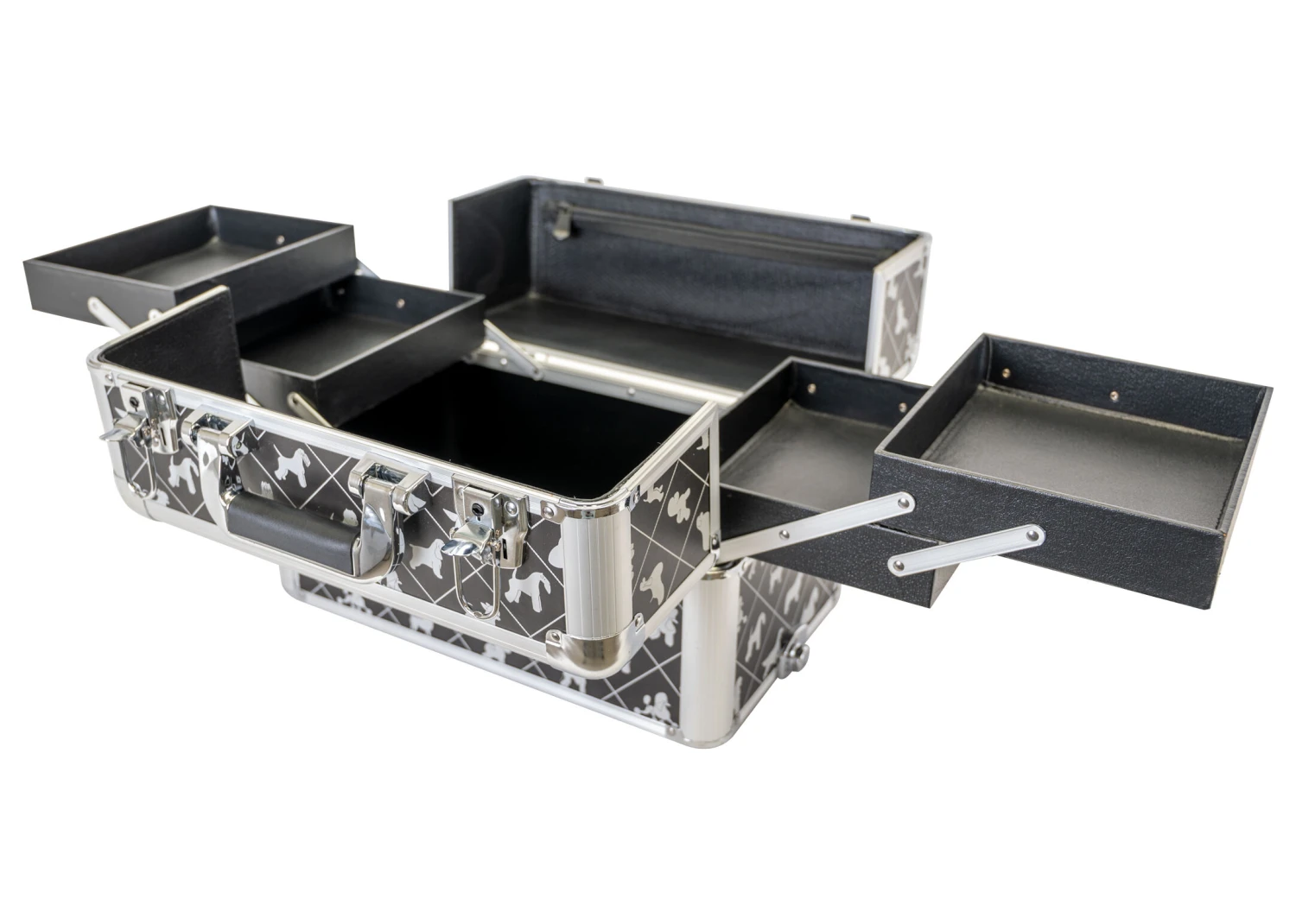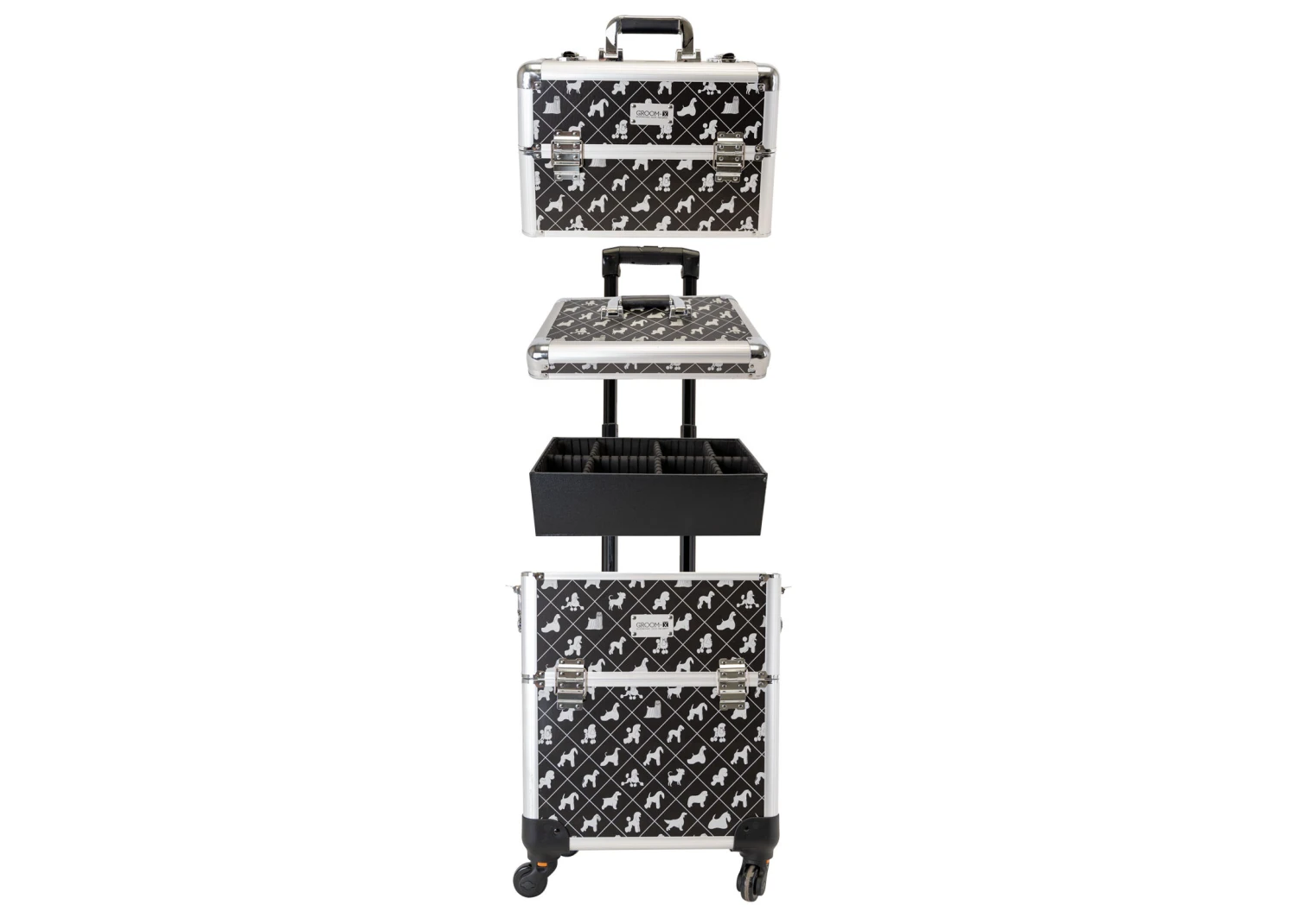 - Very large storage case for all kinds of grooming material (brushes, clippers, sprays etc.) with 4 wheels (360 degrees) and telescopic handle Â
