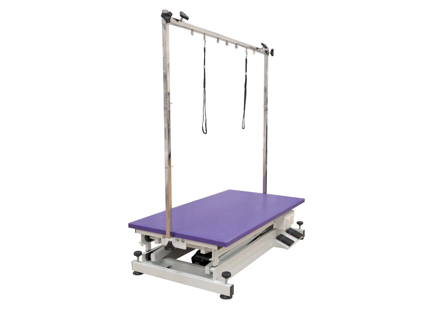 Generous table top measures 110 x 60 cm and is coated with easy-to-clean, soft purple rubber with pawprint motif. This surface is extremely antislip and the rubber covers the edges of the table top so there is no need for the aluminium trim.