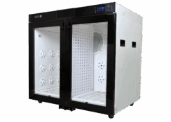 Safety is the most important consideration. This professional cabin dryer is a safe place to dry pets because it provides a constant thermostatically controlled temperature with overheat protection together with a countdown timer with automatic shut off. The double doors feature a dual locking system that is electromagnetic and manual. There is always enough fresh air filtered into the cabin, so pets remain safe and comfortable at all times. Finally, UV sterilisation after each use prevents cross infection and guarantees hygiene.