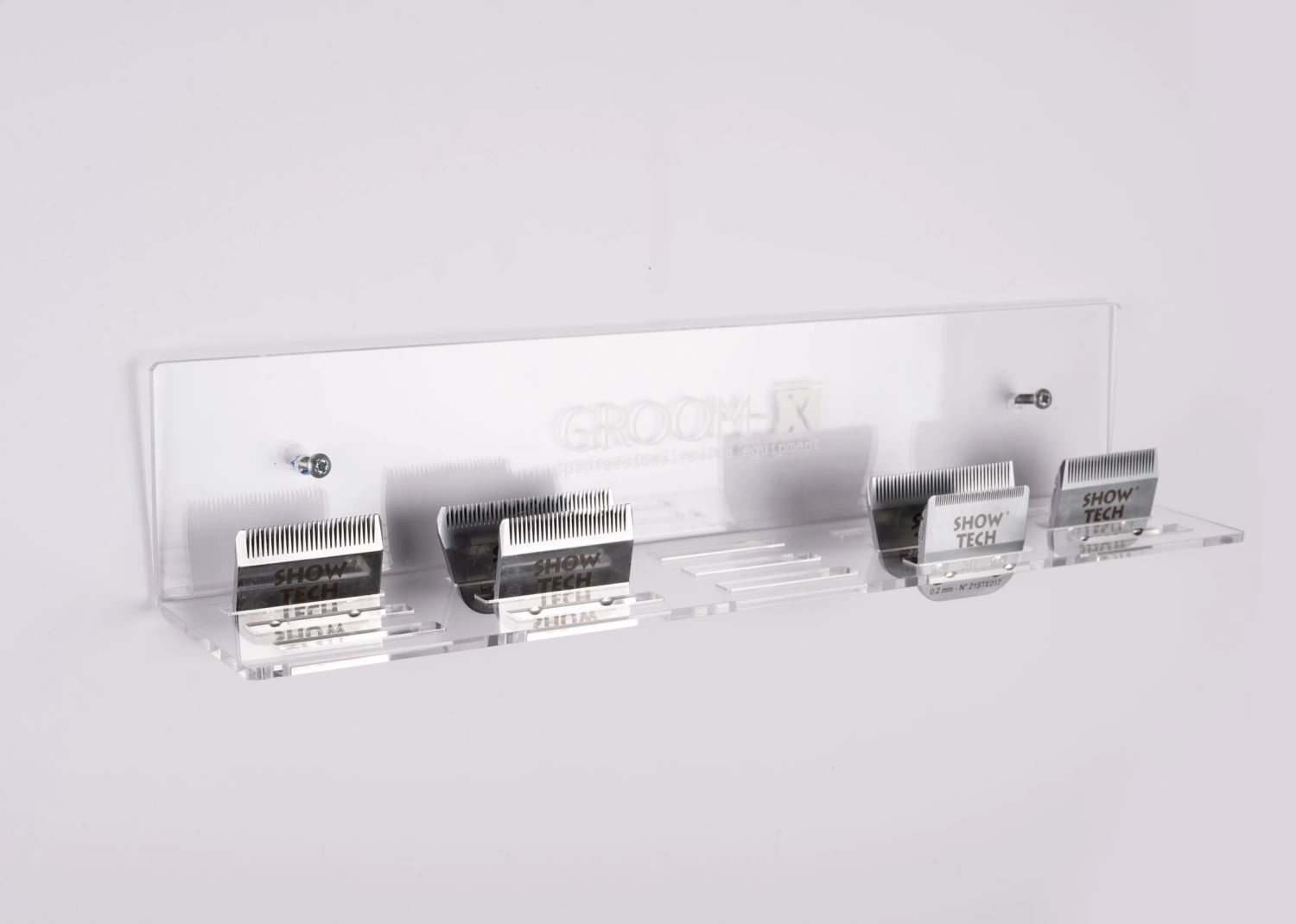 The durable, acrylic rack mounts easily on any vertical surface and can keep up to 15 blades handy and safe. All types of clipper blades, for example the Aesculap and Show Tech Wide, fit in this system perfectly next to each other.