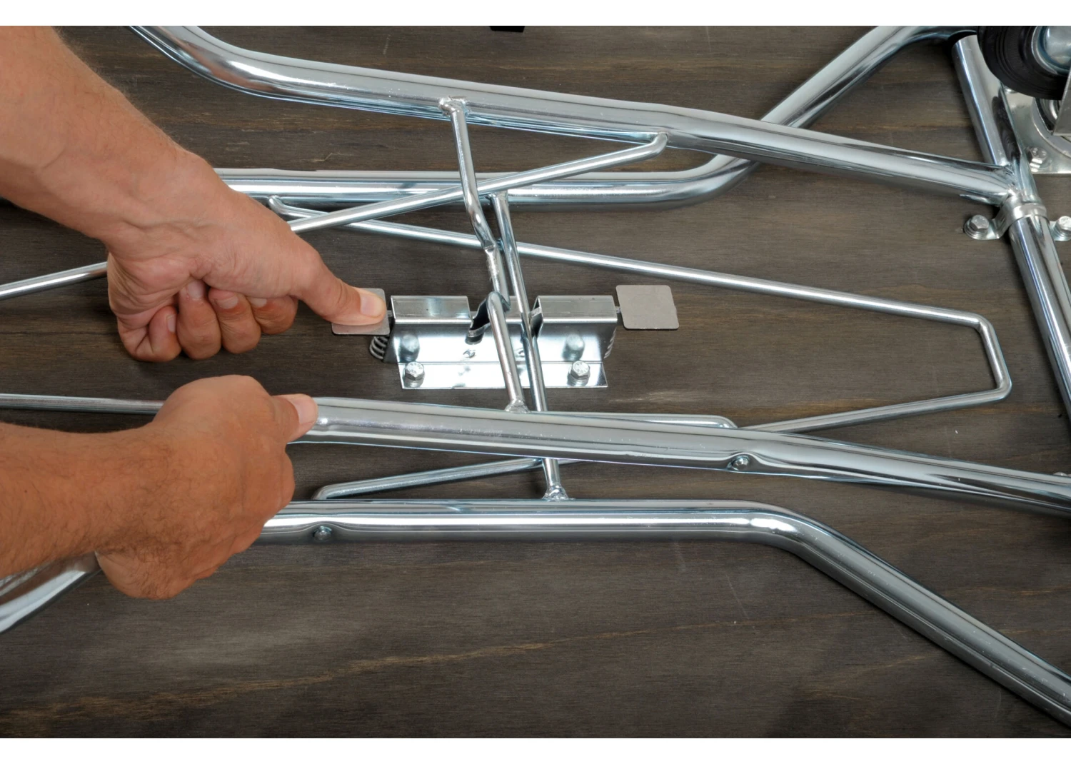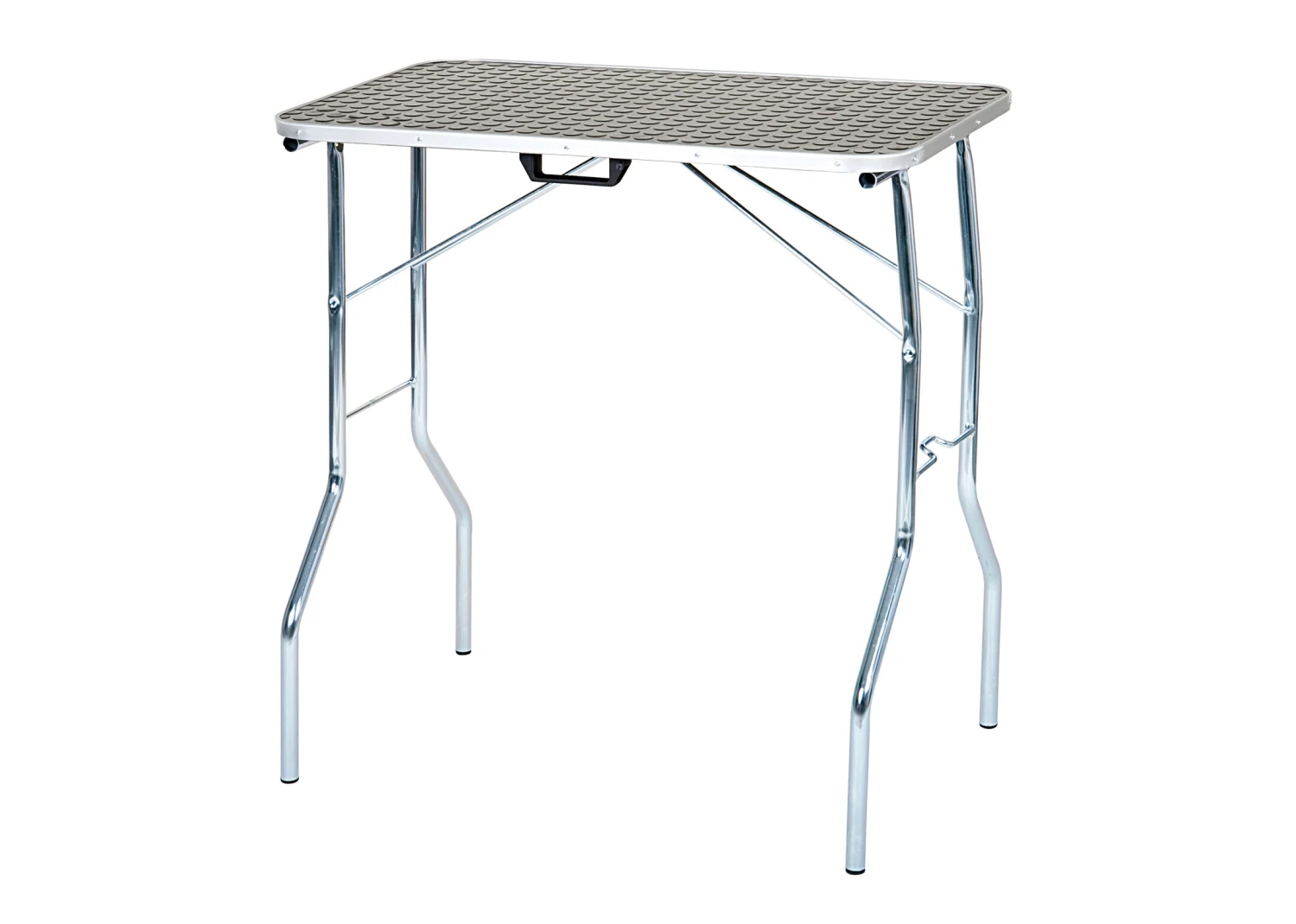 Portable grooming table with quality wood tops and chrome plated steel legs. Easy to erect and fold thanks to the “click” system to lock the legs in place. These sturdy tables feature a black rubber top finished with an anodised aluminium trim. Available in 2 sizes.