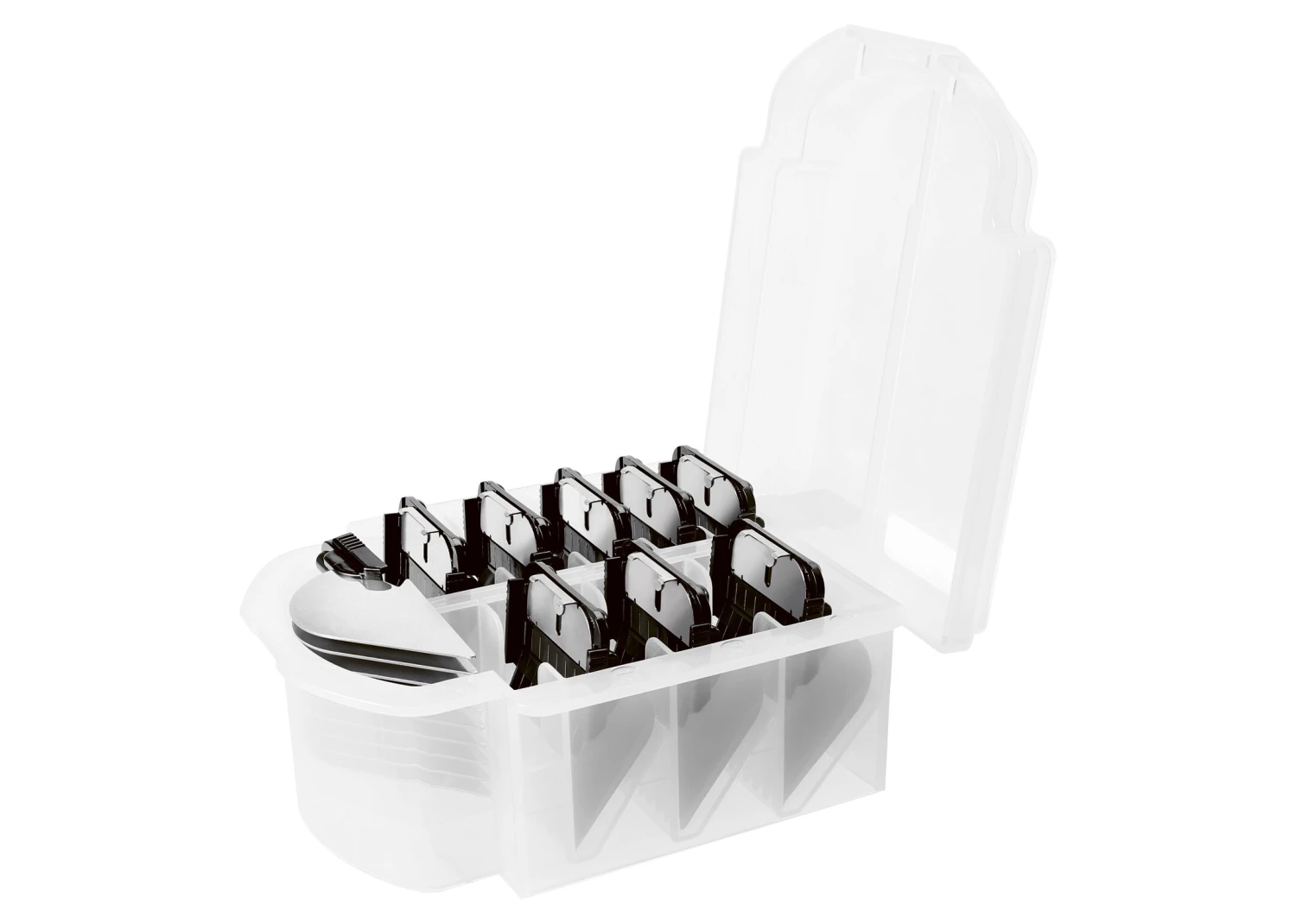 The Heiniger Metal Snap-On-comb set is the set you need to go faster and smoothly through the coat. Nine pieces of different lengths that fits all #10, #15 and #30 snap on blades of any brand like Show Tech, Heiniger, Andis, Oster, … They clip on the blade itself.