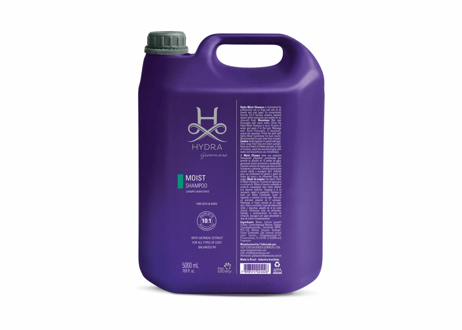 Hydra Moisturizing shampoo is formulated for professional use on dogs and cats, and contains oat extract that has both moisturizing and soothing properties to gently cleanse the skin and coat.  The unique properties of this shampoo make it easier to rinse and allows for faster drying of the coat. This is a professional shampoo designed by groomers for groomers and is suitable for all breeds of dogs and cats. Economical in use, may be diluted 10 to 1. Available in 1L and 5L
