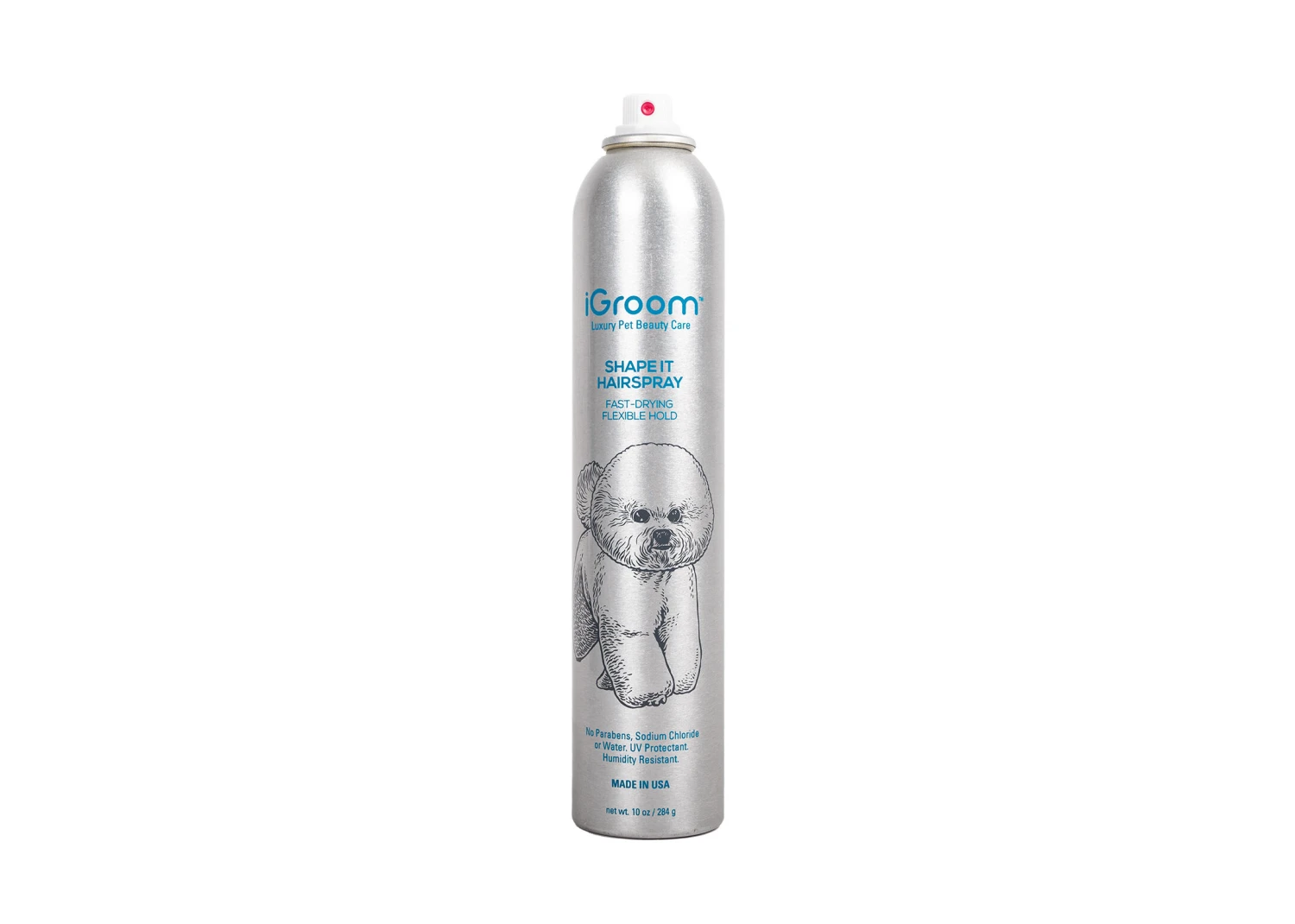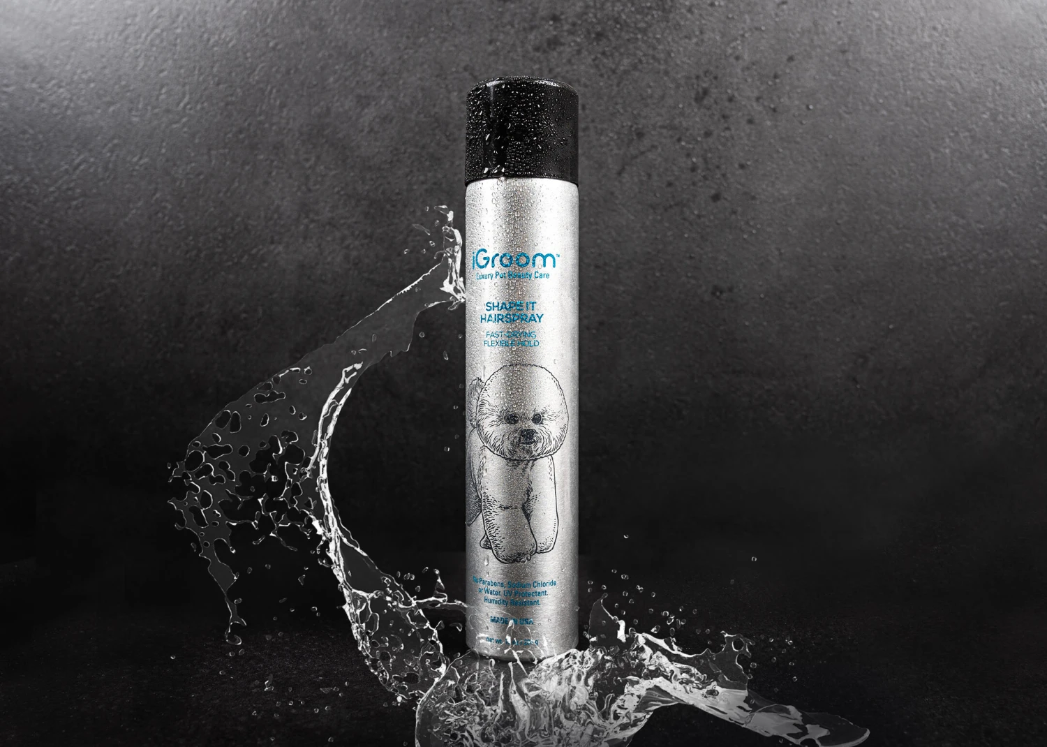 Shape It Spray is iGroom’s waterless fast-drying hairspray. Perfect for a highly-flexible, yet fixative, hold with no sticky residue or build-up. Easy to brush through, even after re-spraying. Great for any types of dog hair that requires both hold and free movement