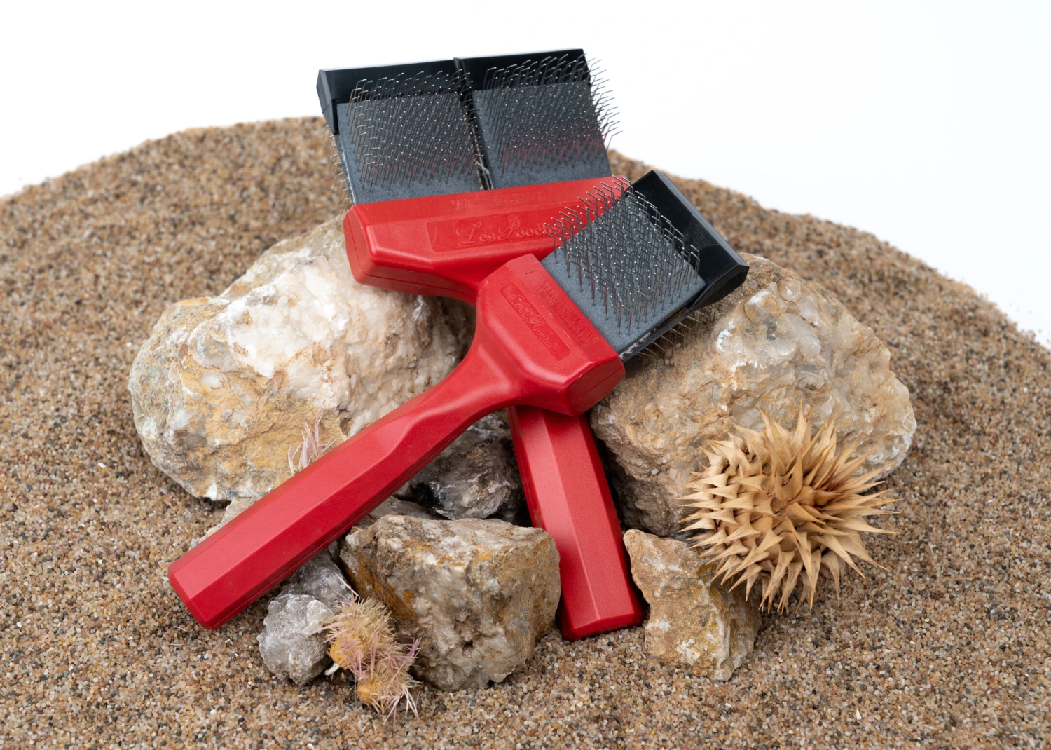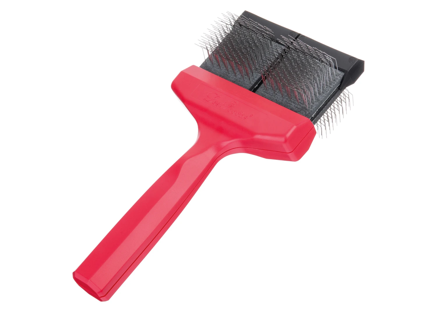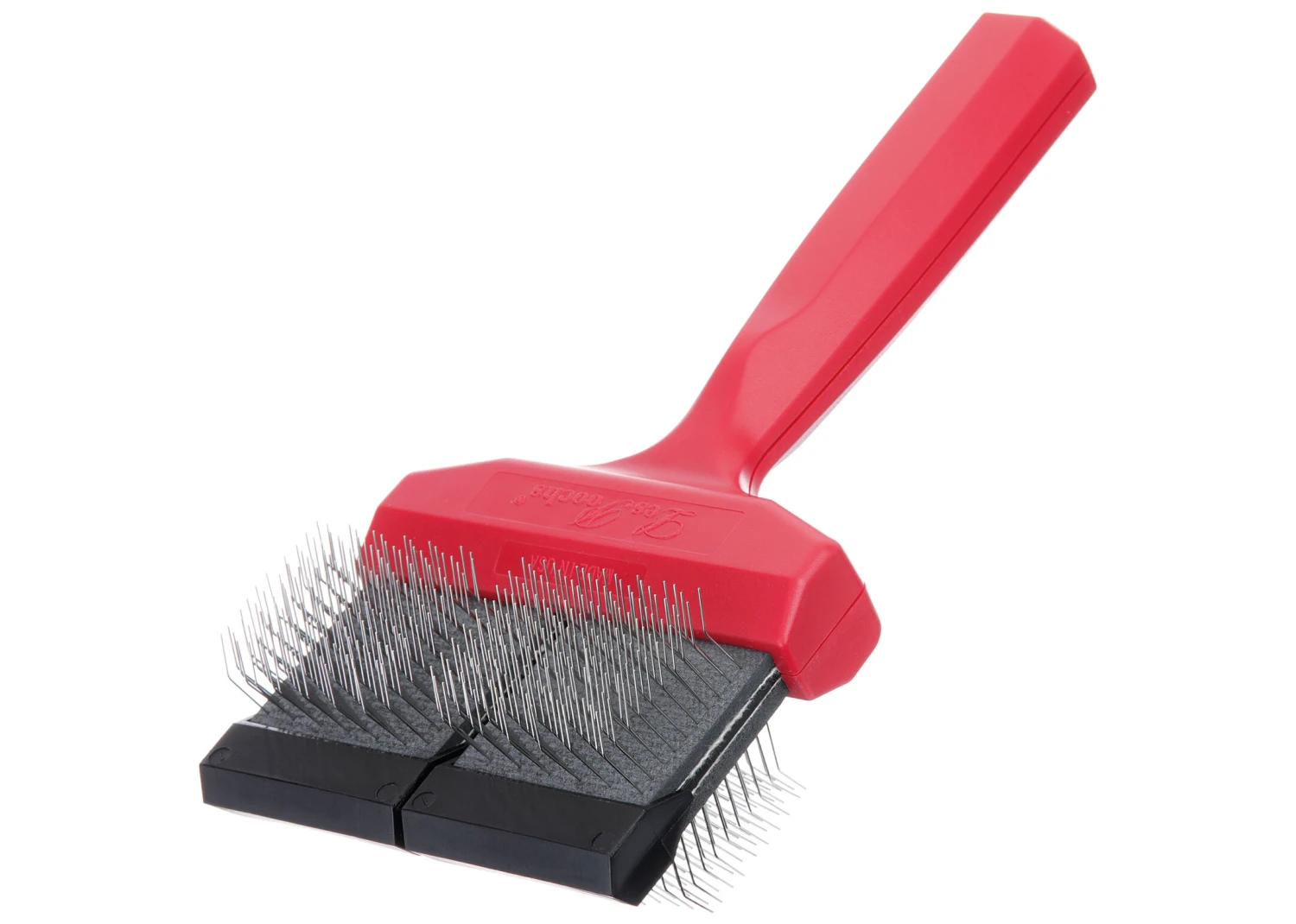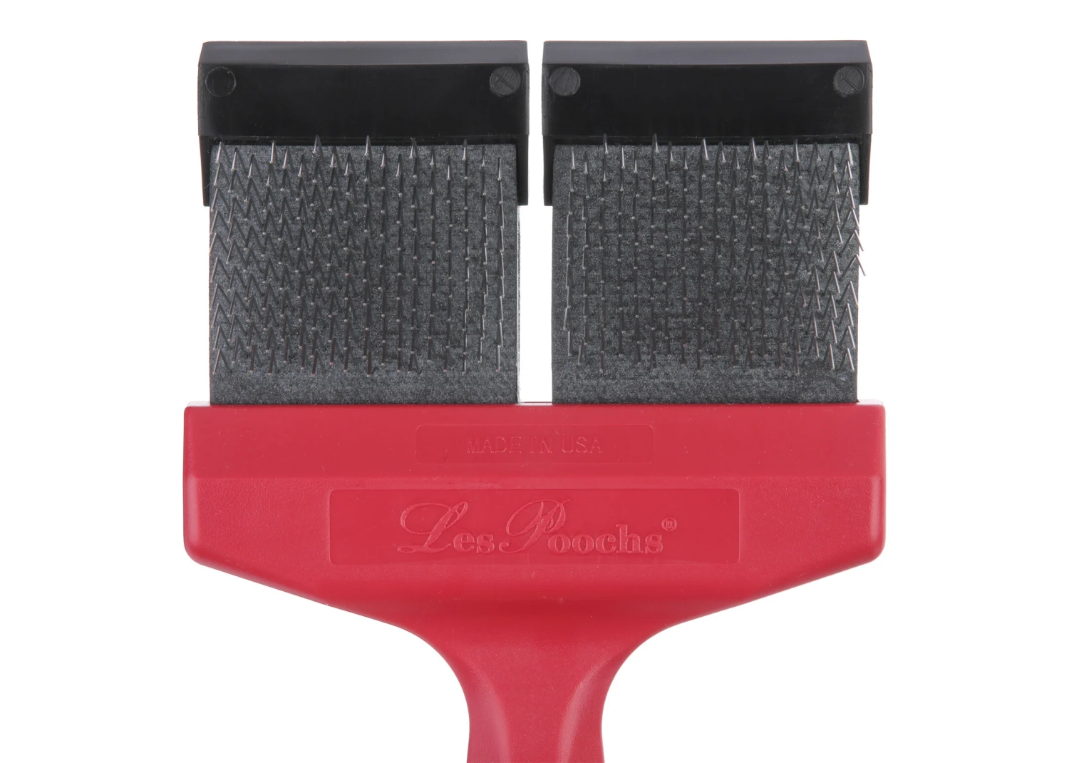 This specific RED colored Les Poochs brush is an Ultimate detangle slicker brush. No need for combs, rakes or detangling sprays. The Matt Zapper takes on the toughest isolated mats – all on its own. Its unique bristle layout quickly and efficiently tackles tangled clumps of fur. Recognized as the first line in matt defense, professional groomers rely on Matt Zapper as the go-to dog dematting tool in “emergency” coats – where the only other option is shaving. This ultimate brush removes stubborn tangles up to 50 times better than our regular brush line. Its very firm head and straight rows of pins allow you to break through any mat.