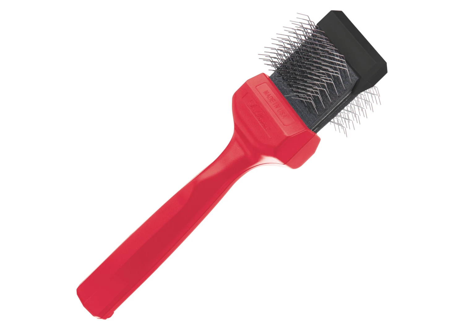 This specific RED colored Les Poochs brush is an Ultimate detangle slicker brush. No need for combs, rakes or detangling sprays. The Matt Zapper takes on the toughest isolated mats – all on its own. Its unique bristle layout quickly and efficiently tackles tangled clumps of fur. Recognized as the first line in matt defense, professional groomers rely on Matt Zapper as the go-to dog dematting tool in “emergency” coats – where the only other option is shaving. This ultimate brush removes stubborn tangles up to 50 times better than our regular brush line. Its very firm head and straight rows of pins allow you to break through any mat.