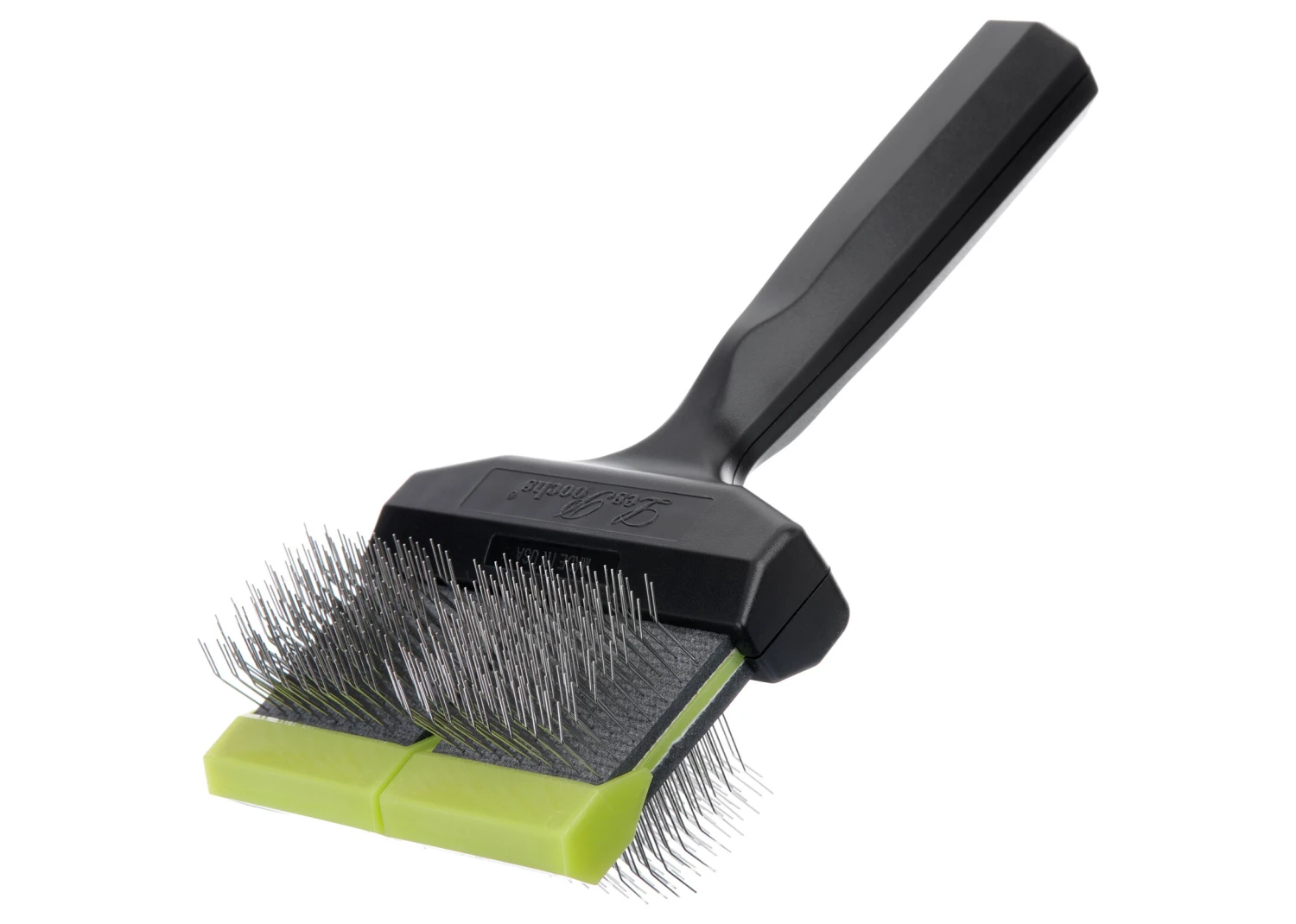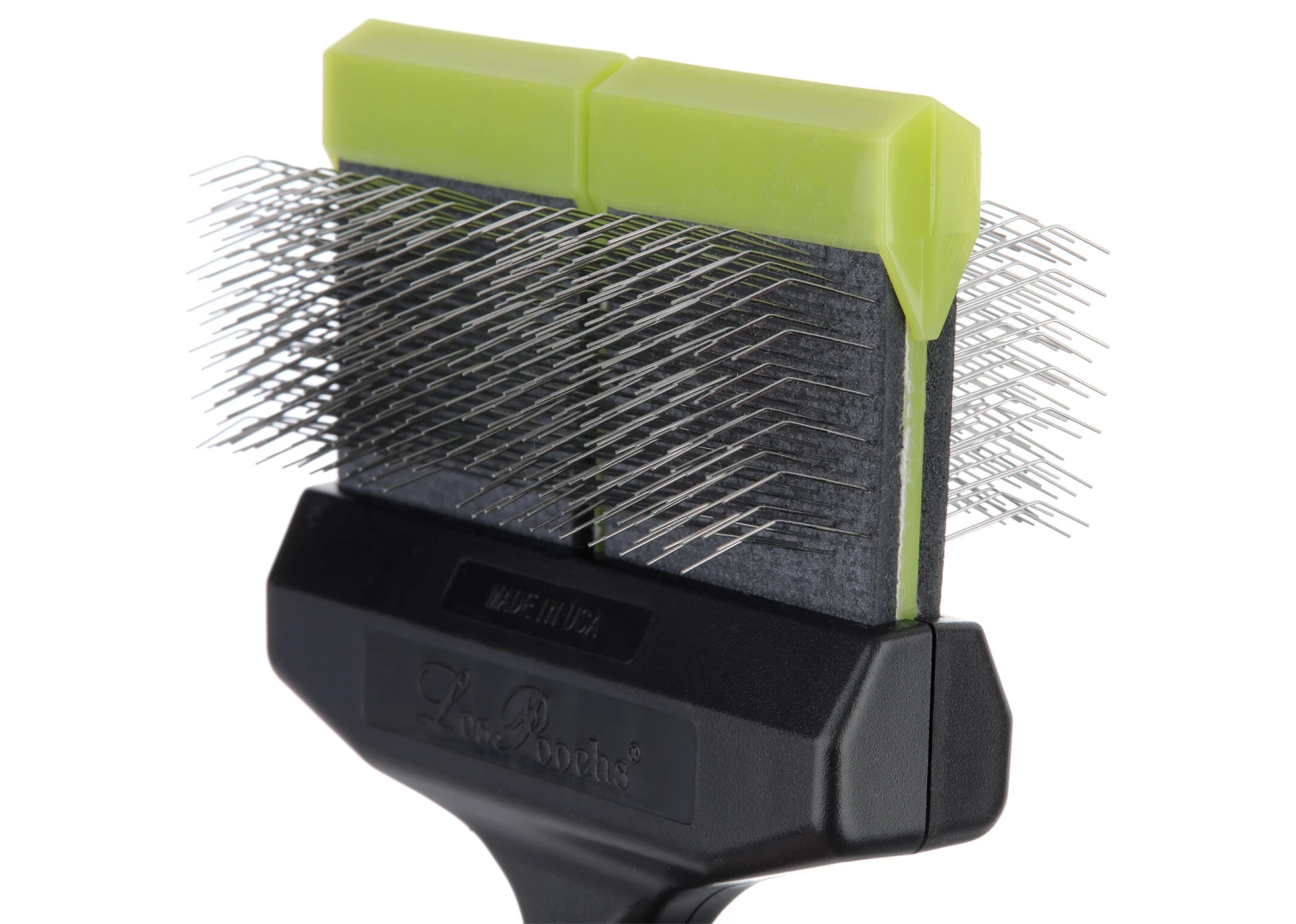 This specific Green colored Les Poochs brush is a Medium slicker brush for soft, smooth & fine coats. Like for example: Bichon Frisé, Poodle, Terriërs, Shih-Tsu, Labradoodle (fine coat), Havanezer, …