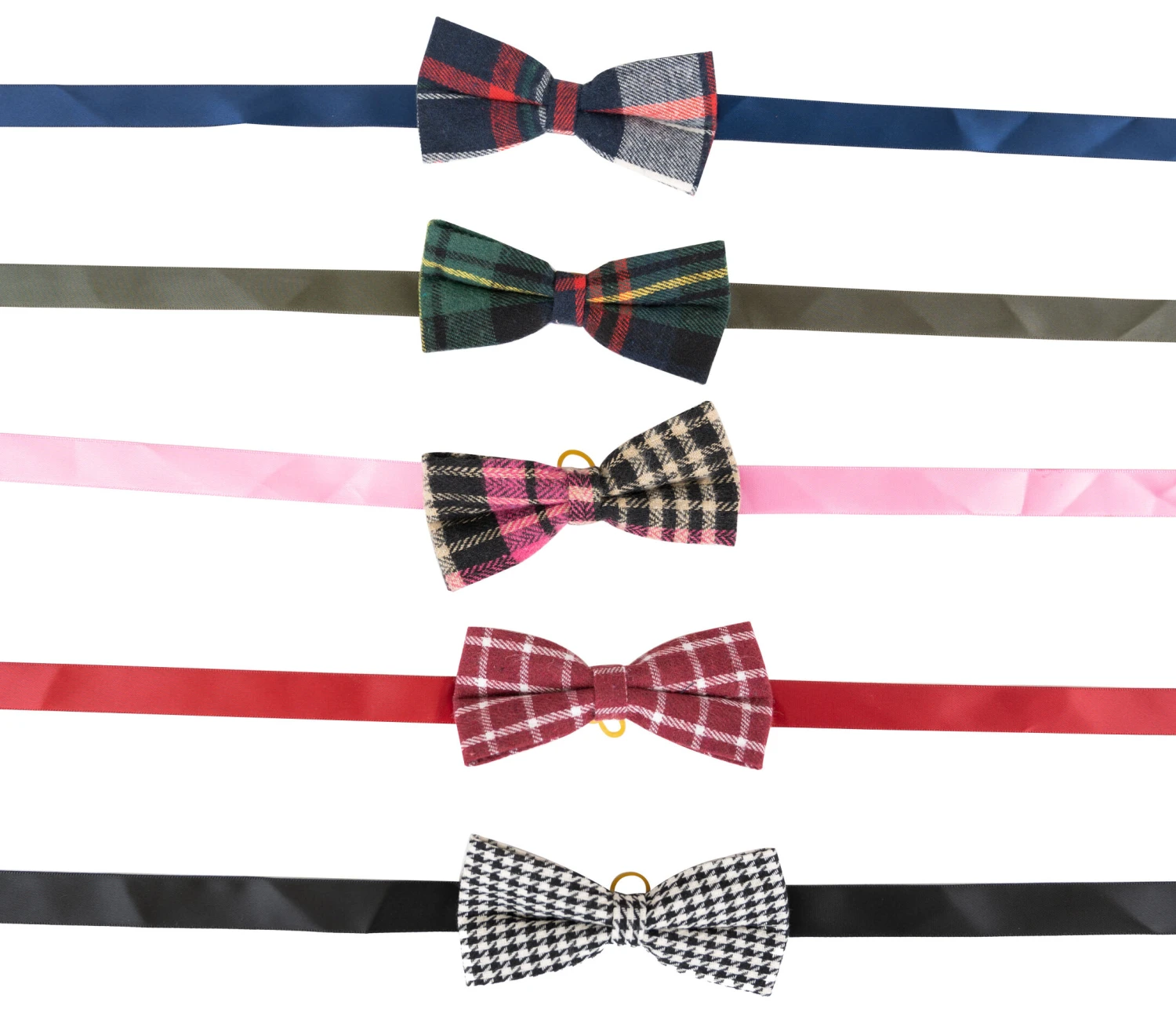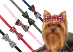 - Multifunctional, fashionable dog bows featuring a small elastic band for around a top knot and 2 ribbon ties for around the neck