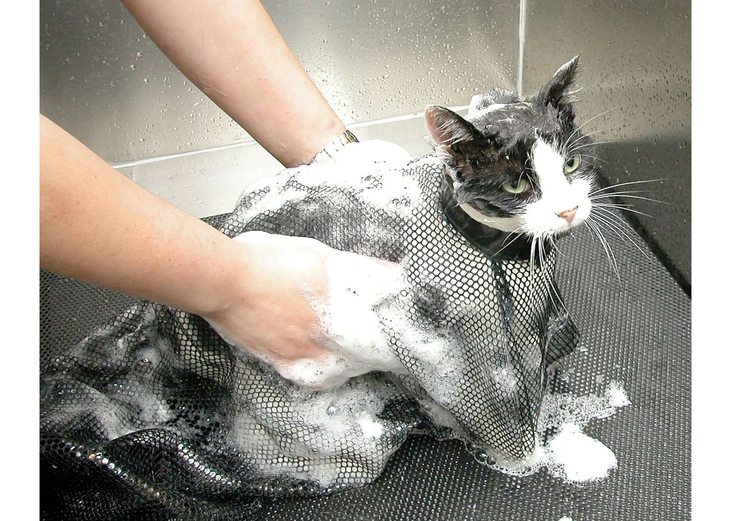 Need an extra hand when washing cats? Use the Cat Bag! This net bag made from lightweight polyester easily allows water and shampoo through. The cat slides easily into the bag via a large opening and an adjustable neckband at the other end safely secures the bag. The cat is totally contained and cannot scratch, but is still free to move. The bag will not absorb water and can be left in place while drying the cat. May also be used for small dogs, rabbits and other small animals. Warning! Never leave animals unattended in the Cat Bag.