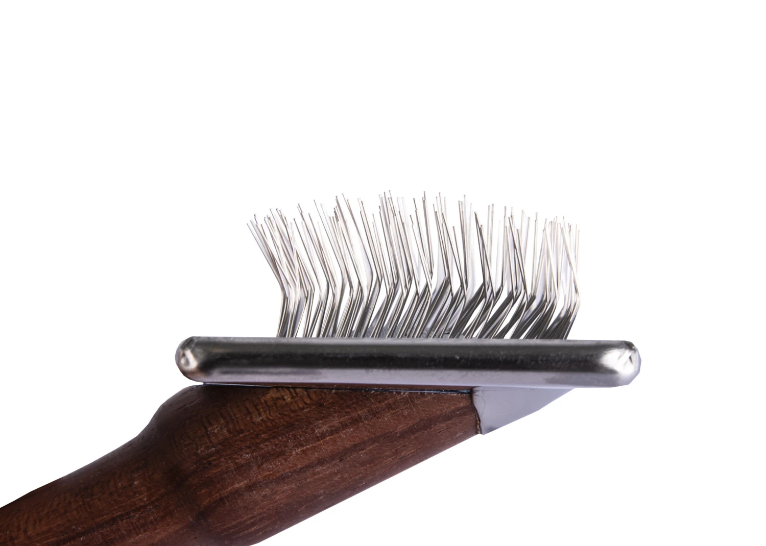 A quality product exclusive to Show Tech! These fine slicker brushes are suitable for all breeds, even the most fragile coats, brushing thoroughly yet softly to remove tangles and straighten the hair. The supple pad allows the pins to flex with the hair, minimising damage and breakage in the coat. Ideal to use while drying the coat due to the fine pin spacing. Available in 4 sizes. New, improved rosewood handle!