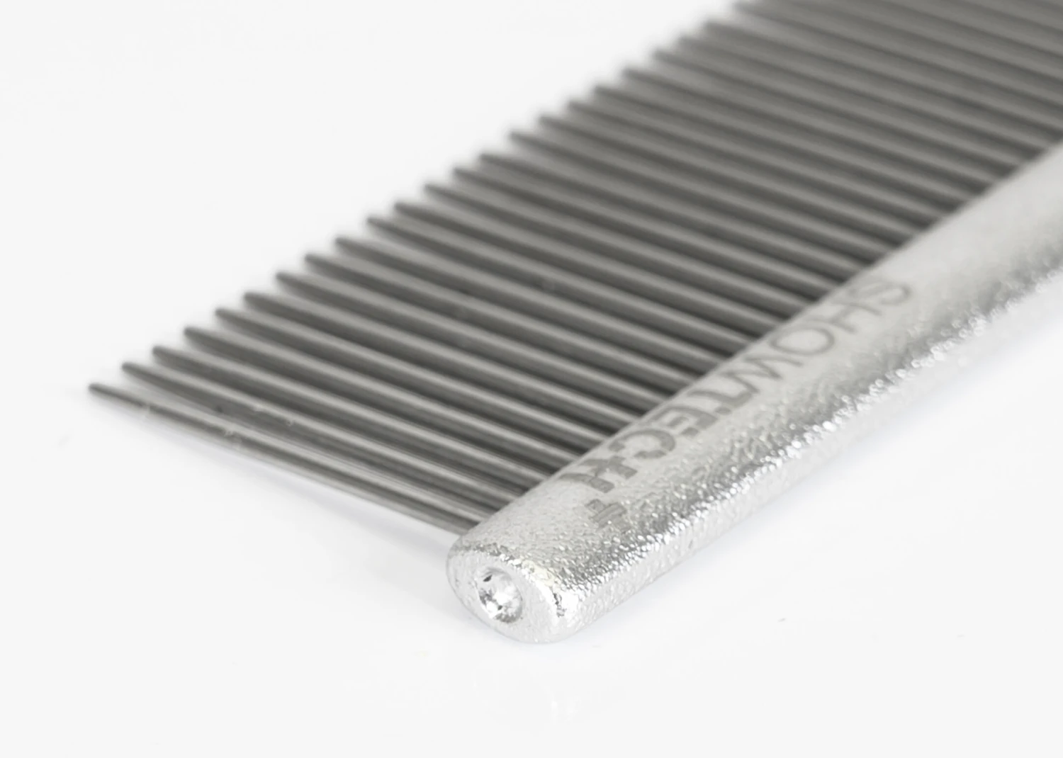 The Show Tech + Featherlight combs are the ultimate in professional combs for styling and fluffing. Made from aluminium with polished stainless steel teeth these combs are the finest and lightest available. Each tooth is perfectly formed with the tip rounded to prevent damage to coat and skin. Available in 3 sizes: 11,5 cm long with 19 mm pins, 25 cm long with 36 mm pins or 28 cm long with 42 mm pins.