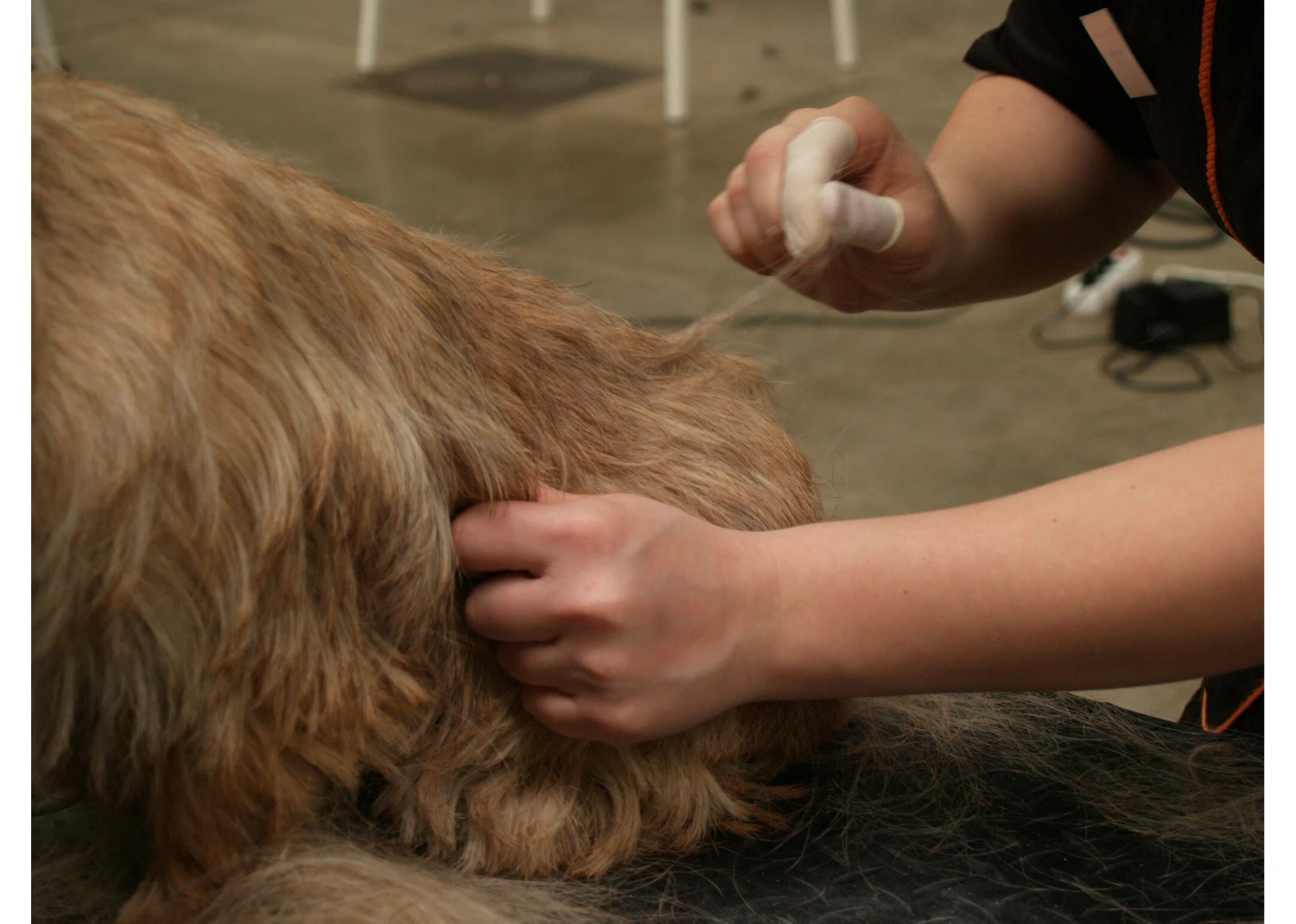 Just slide your thumb and index finger in the finger condoms and make a tweezer with the point of your index finger and thumb. With your other hand, lift a few hairs from the coat with the help of your fingers or a brush. Now you can clearly see the hair points standing up. Hold your hand just above where you lifted the hairs and grip the skin gently. Firmly grip the points between your thumb and index finger and pull in the direction of the hair growth. Only hand strip a few hairs at a time.