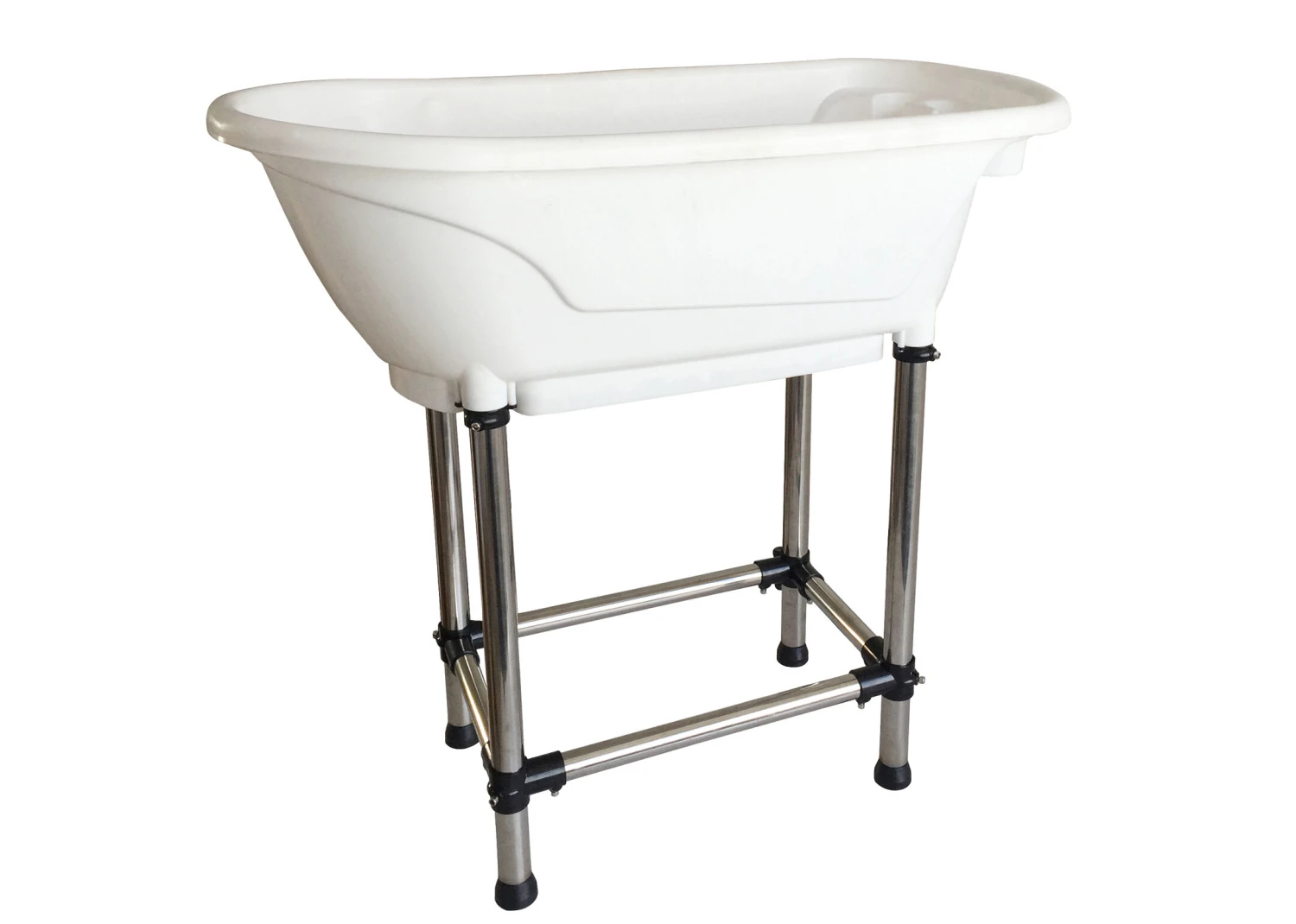 In the Handy tub, your best friend will feel comfortable thanks to the flat, anti-slip floor. The super handy built-in bottle holder ensures that chasing the shampoo bottle around the bath is a thing of the past! Bending over and sitting on your knees until they hurt while washing? No way! The Handy Tub allows bathing at a comfortable and ergonomic height, thus making the whole experience much more relaxing for both you and your beloved pet. Thanks to the 3 stainless steel bath rings, you can attach a leash to stop the dog from jumping out. The sturdy, tubular frame is very stable and can be easily and quickly assembled with the provided tool. Best suited for small to medium-sized dogs (up to Cocker Spaniel size, maximum 40 kg). The bath comes with a flexible drain hose (max. 67 cm).
