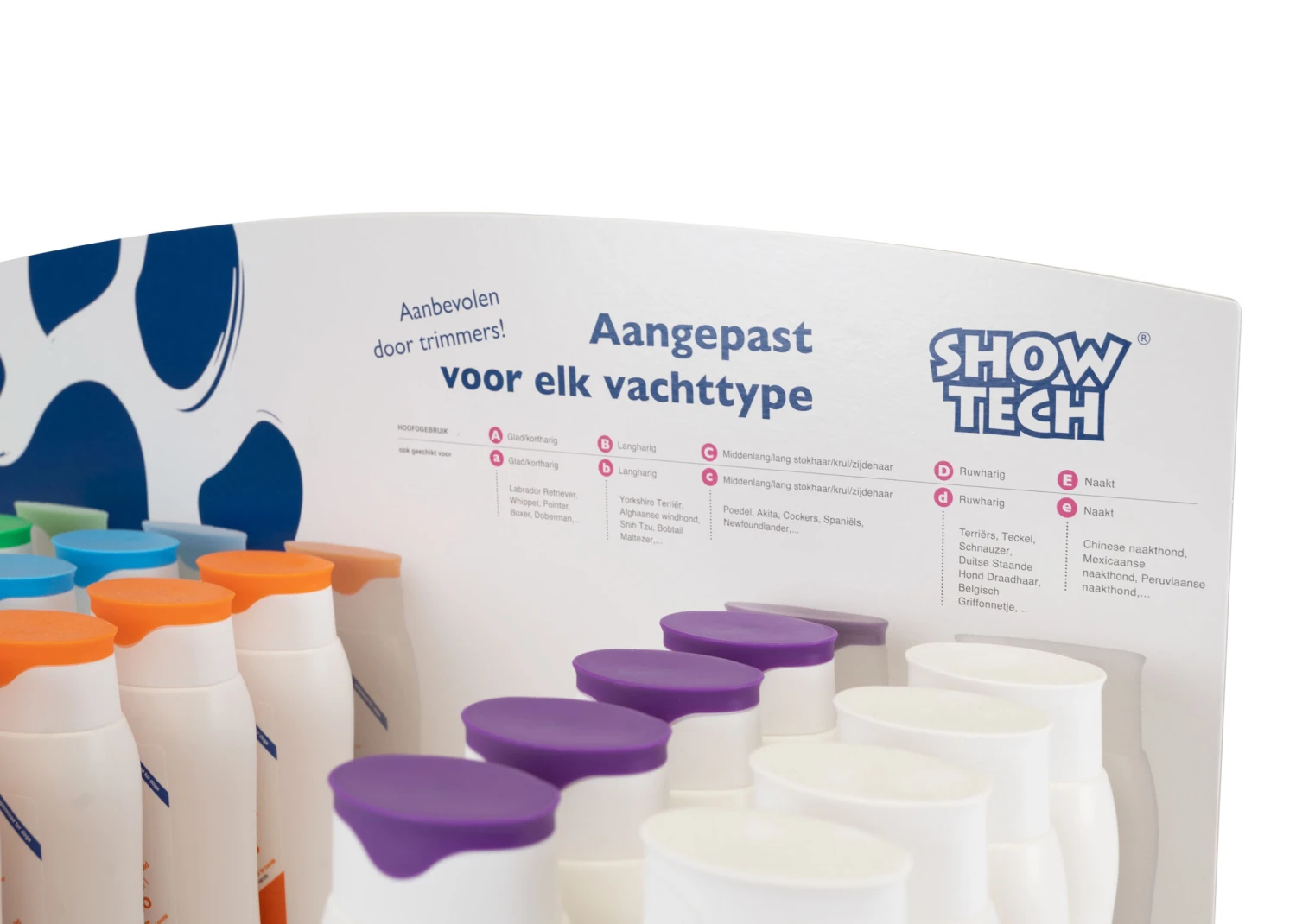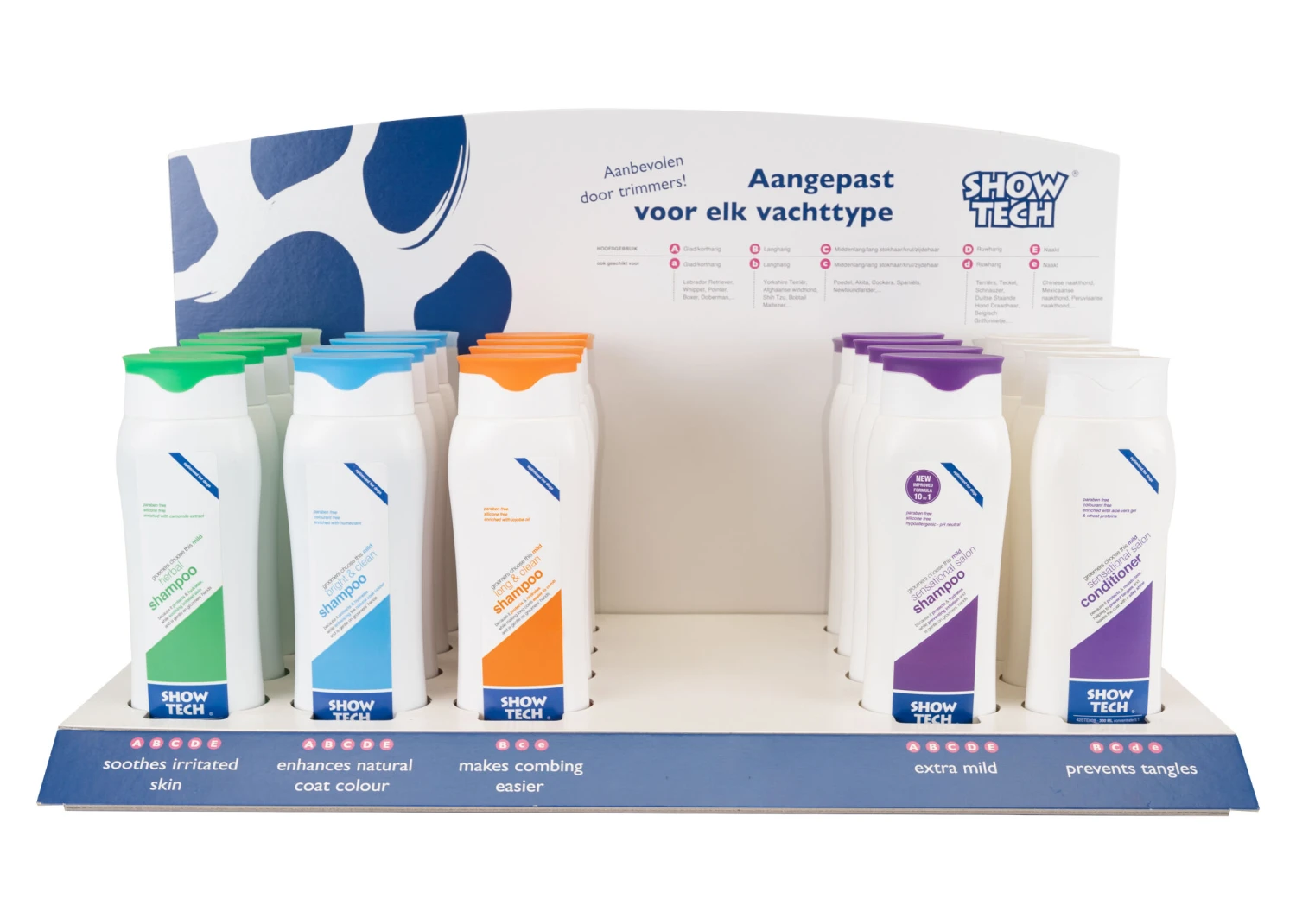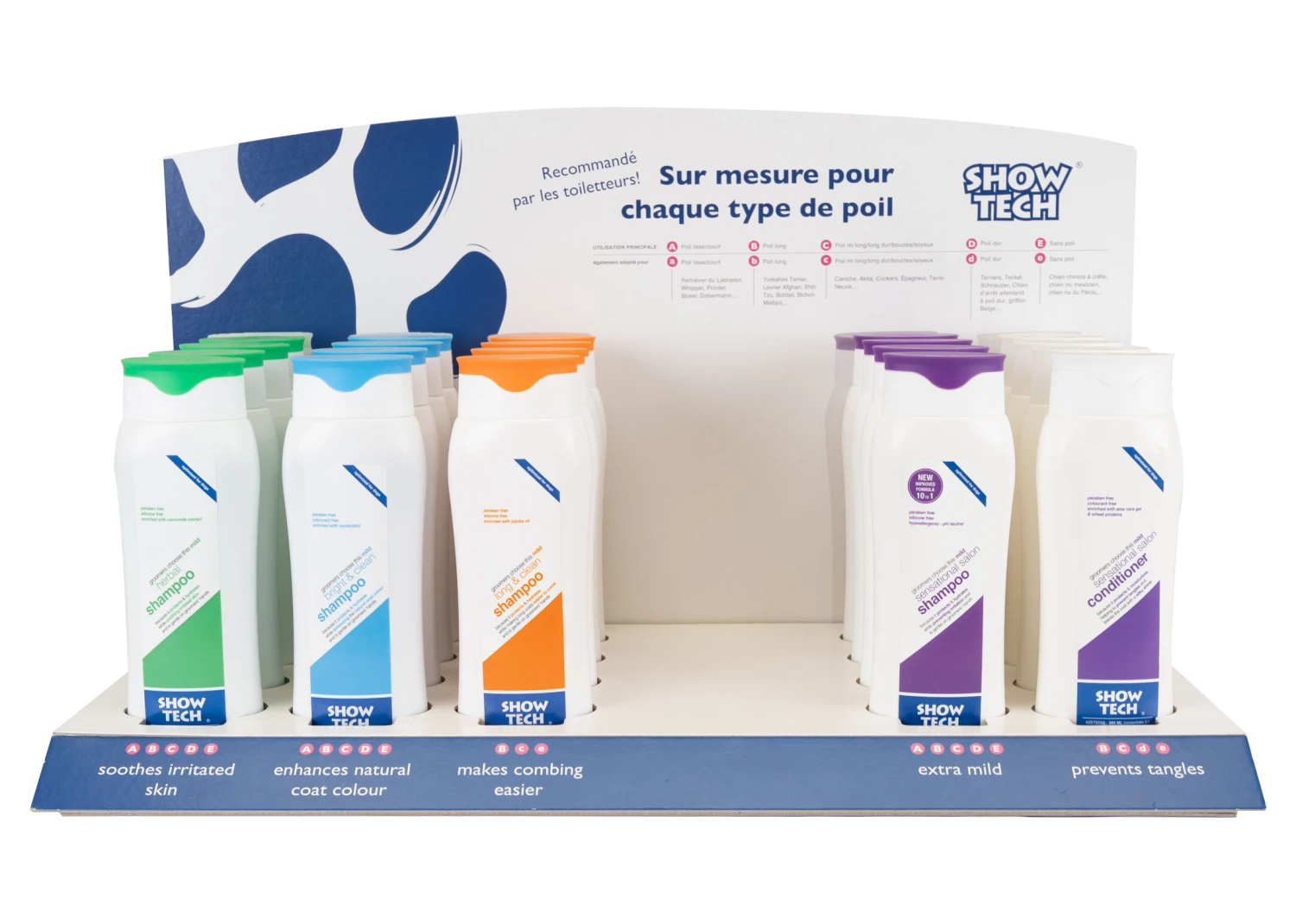 This compact counter-top merchandising display is a great way to generate impulse sales of Show Tech shampoo and conditioner. Attractive design with informative text available in 4 languages, this display will generate extra profit for your business while helping your customers maintain their pet’s coat between appointments! Supplied complete with 20 x 300 ml bottles of Show Tech shampoos and conditioner.