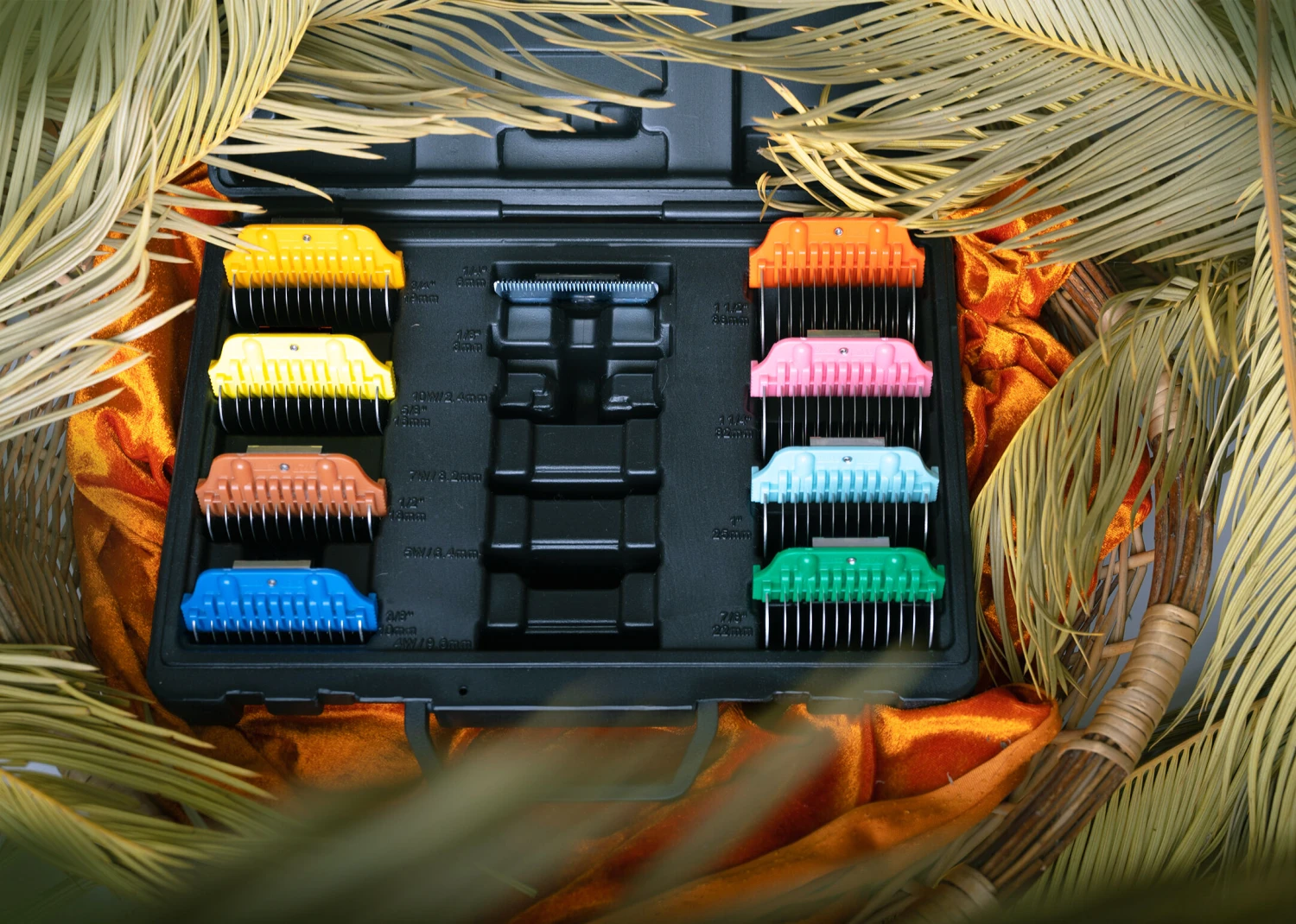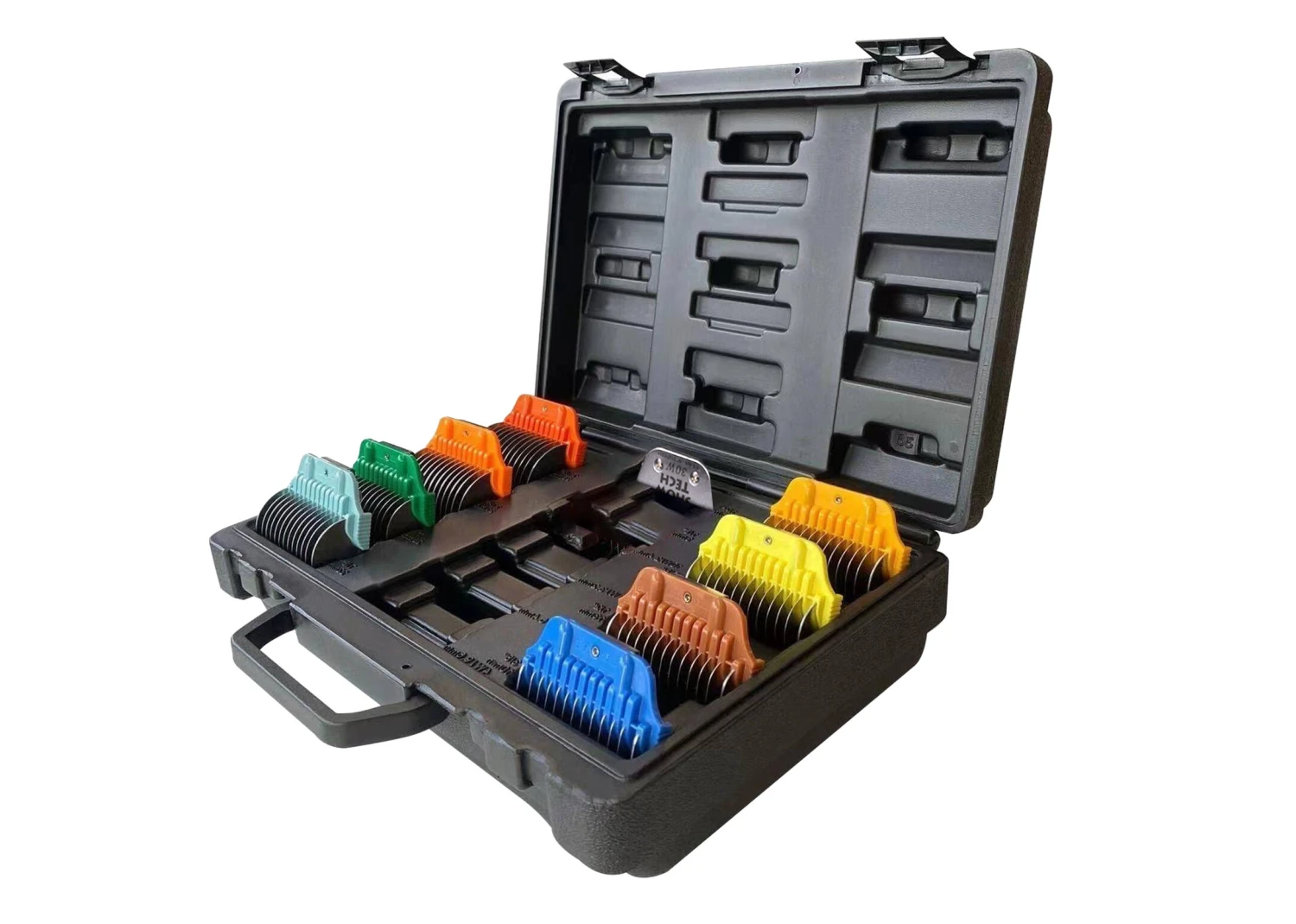 These 8 extra wide stainless-steel snap-on combs suitable for the Show Tech wide clipper blade #30 help you work even faster and give a smooth finish to all coat types. They allow you to play with different lengths and create the style you want. Moreover, because you can use these combs to reduce scissoring, your fingers and wrists will be spared a lot more, which results in fewer physical complaints and easier work. For less experienced groomers, these combs can also be a great tool. They help you to apply the right length super-fast and without doubts. Or maybe you already have one snap-comb, but do you notice during grooming that several would be more convenient? With this kit you immediately have all the different lengths of combs at your disposal.