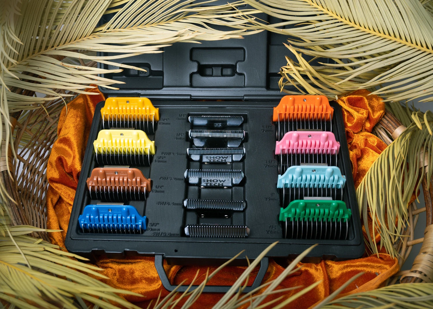 These 8 extra wide stainless-steel snap-on combs suitable for the Show Tech wide clipper blade #30 help you work even faster and give a smooth finish to all coat types. They allow you to play with different lengths and create the style you want. Moreover, because you can use these combs to reduce scissoring, your fingers and wrists will be spared a lot more, which results in fewer physical complaints and easier work. For less experienced groomers, these combs can also be a great tool. They help you to apply the right length super-fast and without doubts. Or maybe you already have one snap-comb, but do you notice during grooming that several would be more convenient? With this kit you immediately have all the different lengths of combs at your disposal.