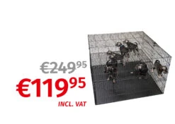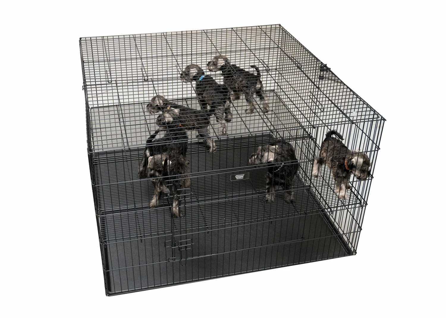 Show Tech Puppy Play Pens are ideal for keeping puppies and show dogs dry and clean with a hygienic fine mesh floor panel to elevate puppies while the moulded, plastic tray underneath catches those “little accidents” and makes for easy cleaning. These playpens are finished in smart, matt black, zinc plating to protect against corrosion. The height of the floor panel is adjustable, so may be set higher for puppies and small breeds and lower for larger breeds. Top and side doors allow easy access and feature a positive locking system for added security. Folds flat for convenient travel and storage. Available in 3 sizes.