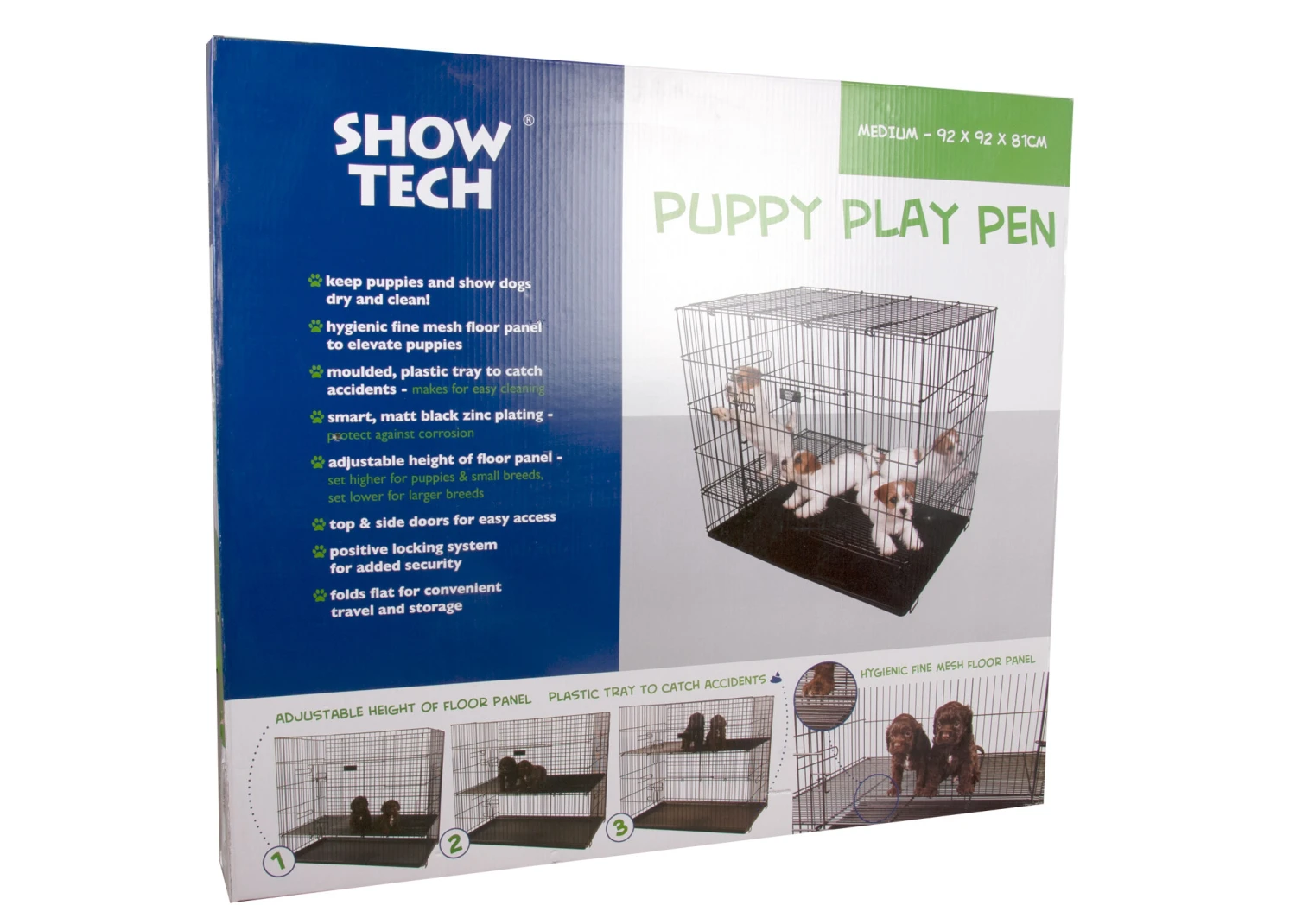Les parcs Show Tech pour chiots sont idéales pour les chiots et les chiens d’expo pour maintenir les chiens au sec à l’aide d’une grille fine hygiénique qui sert comme panneau de plancher pour les chiots, tandis que le fond en plastique moulé en dessous récupère tous les petits « accidents » qui sont facile à nettoyer. Ces parcs sont en noir mat élégant et galvanisé pour protéger contre la corrosion. La hauteur du panneau de plancher est adaptable, et peut donc être placé plus haut pour les chiots et les petites races et plus bas pour les grandes races. Une porte sur le côté et le dessus assure un accès facile et un système de verrouillage fiable pour une sécurité accrue. Peut être facilement stocké car il peut être complètement plié. Disponible en 3 tailles.