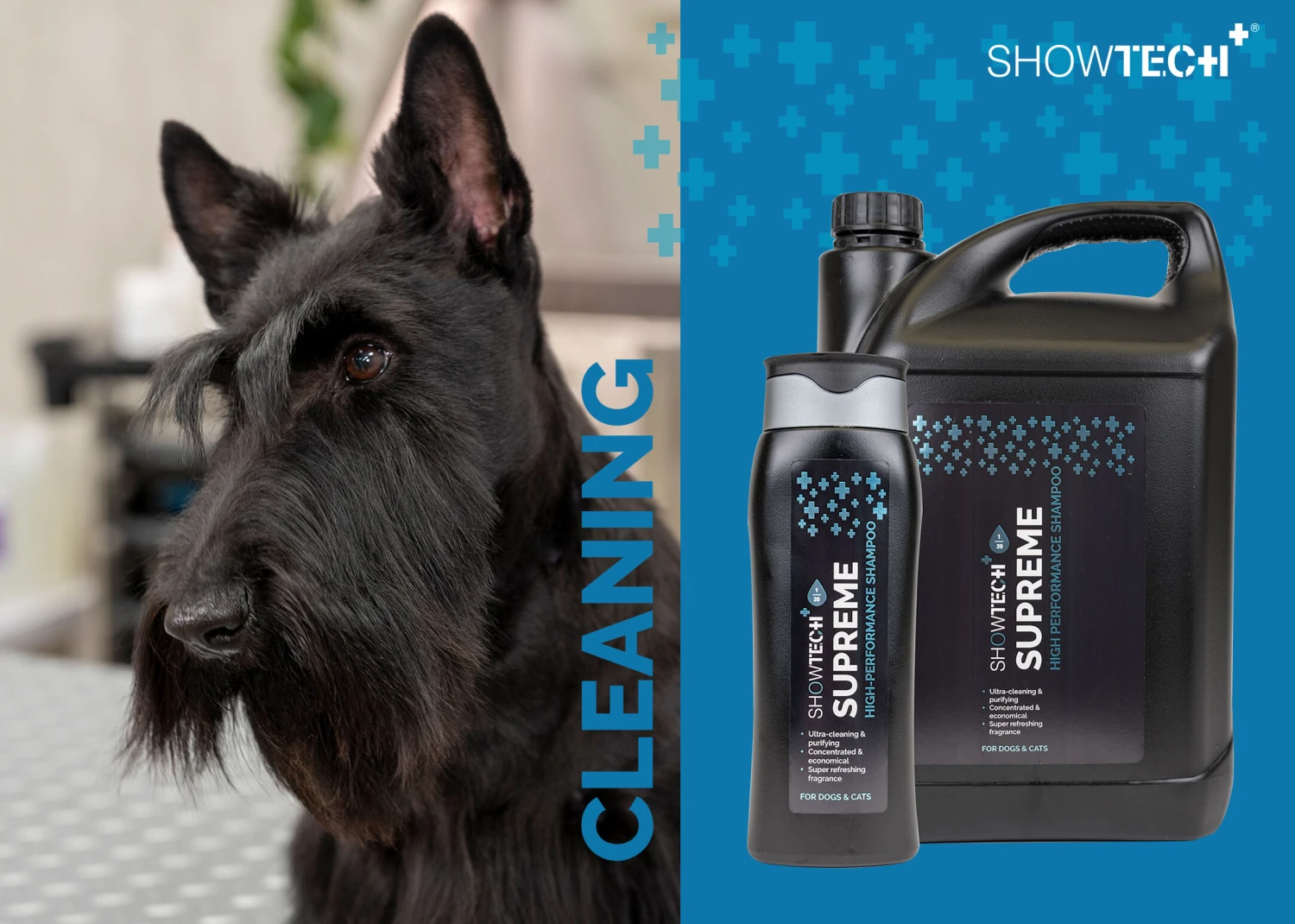 The Show Tech+ Supreme Shampoo is a purifying, multifunctional and very economical shampoo. Super concentrated (1/20), this shampoo ensures that the skin is thoroughly cleansed without drying out the coat. It removes all traces of sebum, oil, dirt and grease from your dog’s or cat’s skin and hair. This way, the coat is completely ready for the next steps: a treatment with another shampoo or a conditioner from our Show Tech+ range.