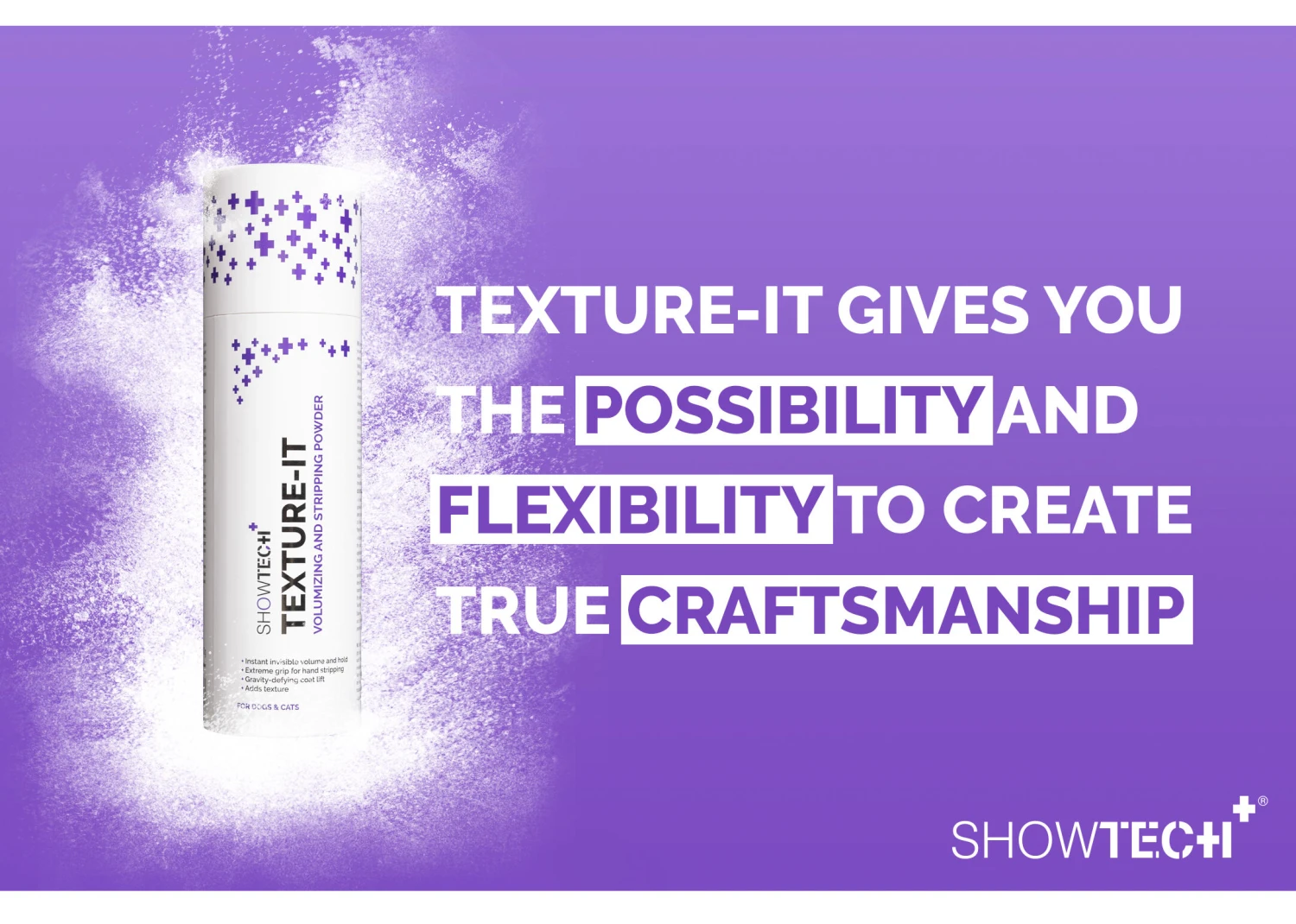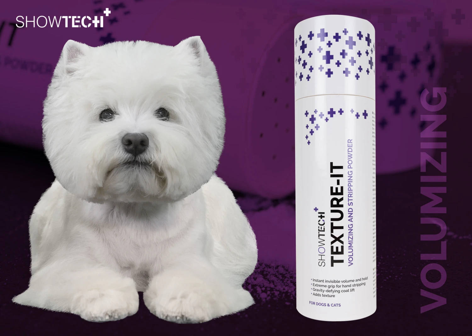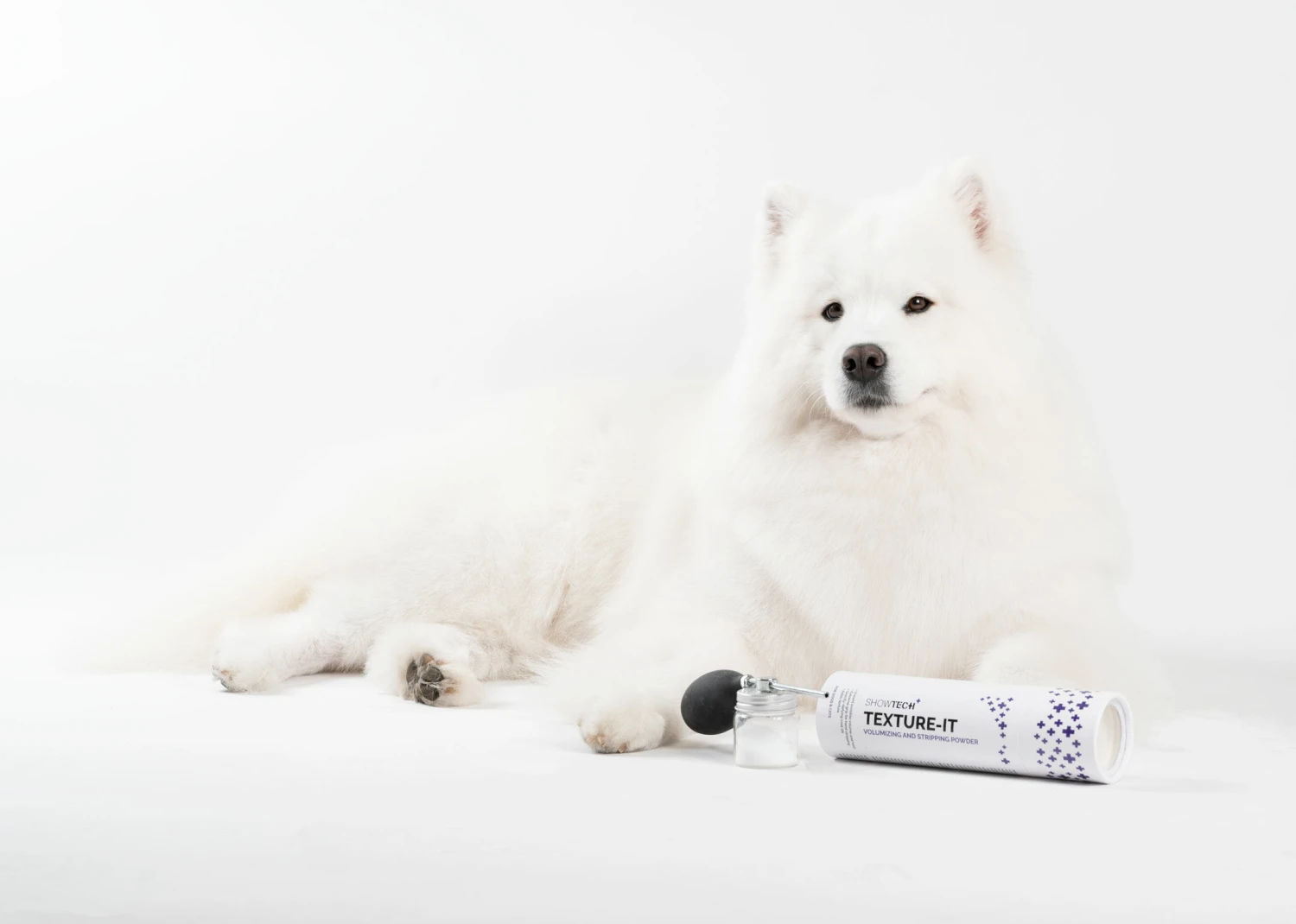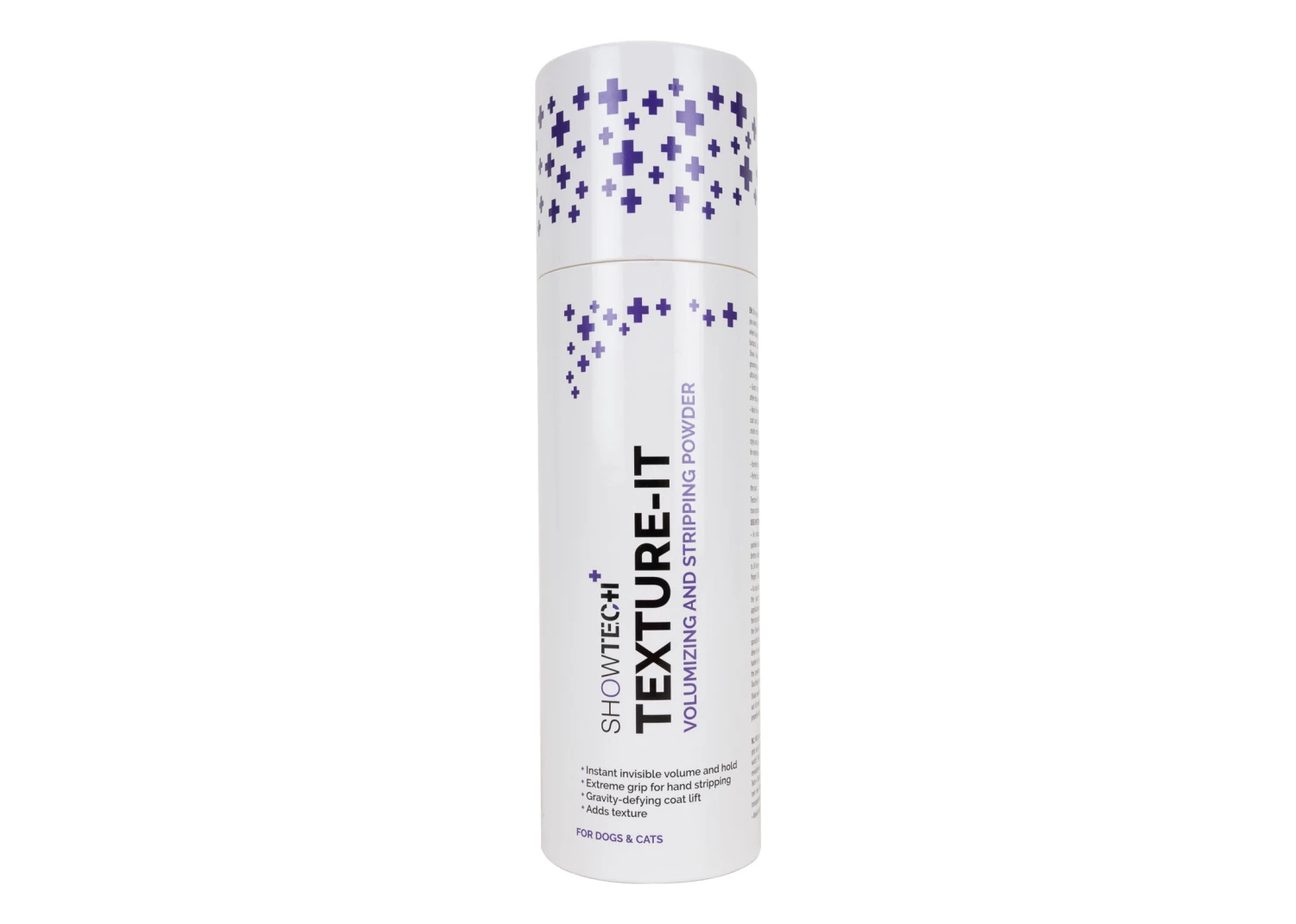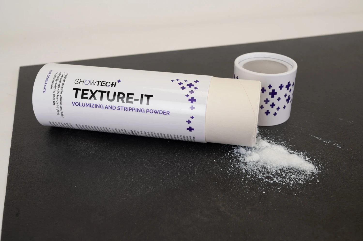 The Show Tech+ Texture-IT Powder is perfect as well for use in grooming salons when scissoring and styling the hair of older dogs. These dogs often have less hair that does not stand up easily anymore. By using this amazing powder, scissoring and styling will be much easier because the hair will stand up straight again. Â