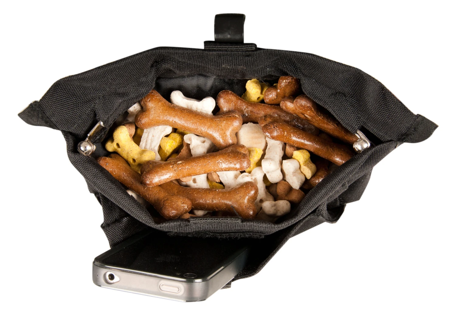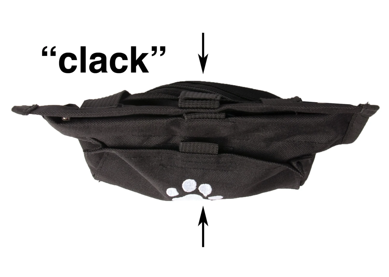 Perfect for your dogs favorite treats. Opens and closes with a click clack system to prevent treats falling out. Ideal for shows and training or simply when walking with your dog. Complete with separate zipped pocket for keys or wallet etc. Decorated with an embroidered paw print motif, supplied with clip and belt (max. length 125 cm)