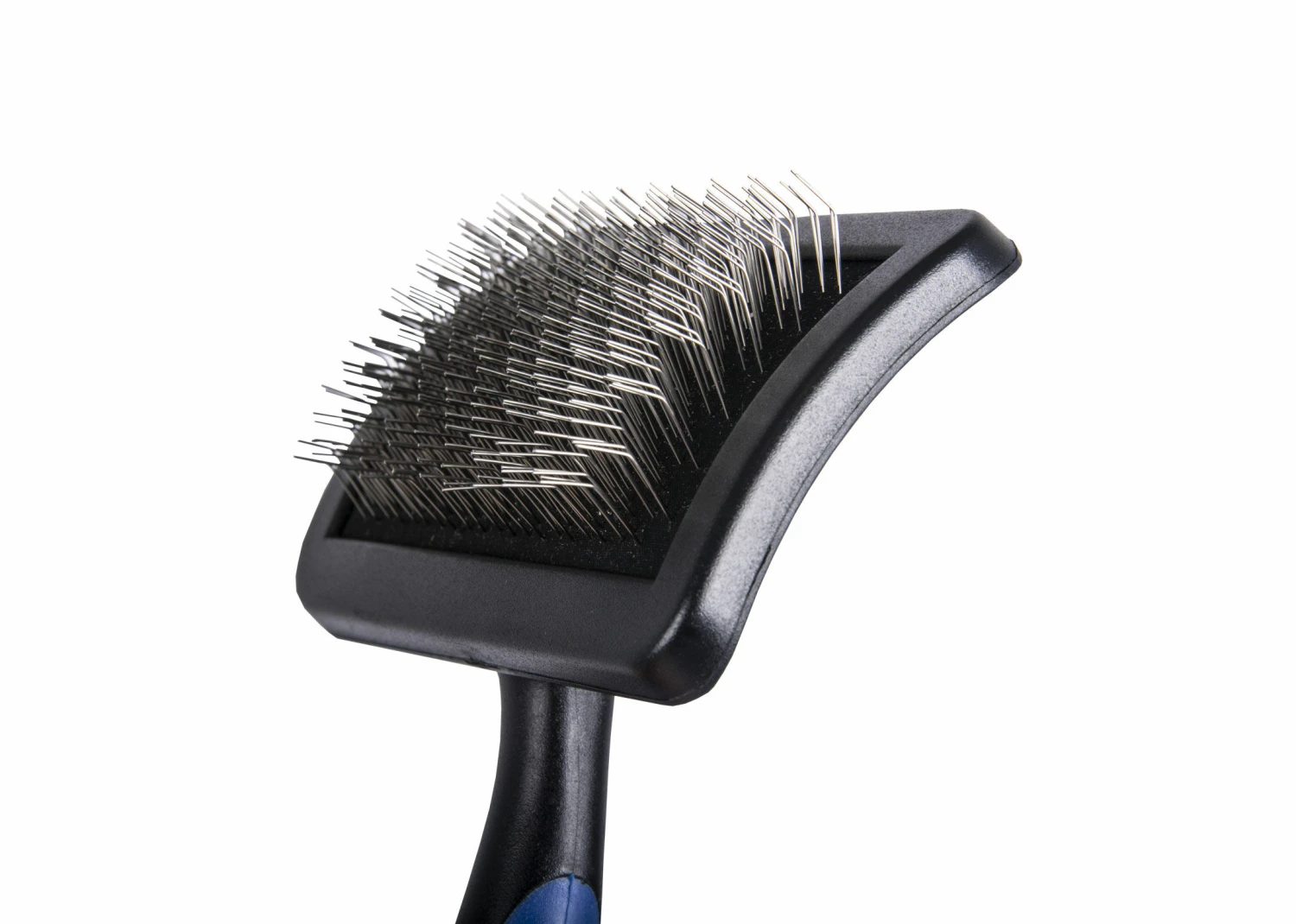 Instructions for use: Long coats-Gently brush with a light, long stroke, brushing beyond the ends of the hair tip to avoid static and breakage. For best results brush the hair in layers. Start at the bottom by parting the coat horizontally and holding the un-brushed portion up with your free hand. Work methodically upwards, keeping your wrist straight to avoid contact with the dogs skin. Curly coats-Brush in the direction of coat growth and then against it using light, long strokes Harsh coats-Brush the coat in the direction of coat growth then against if necessary to remove mats and dead hair. Pay special attention to areas that are prone to matting, like behind ears, on the loins and under the legs. Use a coarse comb to check for any remaining mats after brushing. The Universal Duo-Pin slicker is ideal for use after bathing while blow drying the coat. Use light, long strokes with and against the direction of coat growth. Brush slowly to avoid static build-up. If the coat is matted, use the Universal Duo-Pin slicker in combination with a Matbuster de-matting tool. To prevent mats and tangles, the dog’s coat should be regularly bathed, treated with a conditioner and brushed daily.
