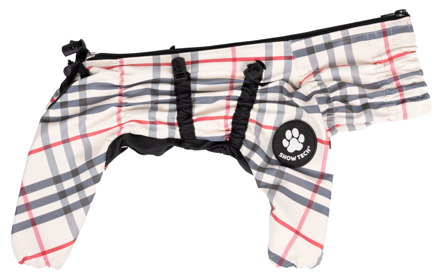 The Show Tech Trouser Suit can be adjusted with drawstrings on the chest, waist, neck, ankles and around the tail to guarantee a comfortable fit for all breeds while allowing your dog maximum freedom of movement. These suits all have appropriate openings underneath to allow dogs to “do their business” (males too!) and are available in many different sizes to fit all breeds. Also features a higher collar to keep your best friend dry and a specially designed zip on the back that can be easily zipped up without hair getting caught in it.