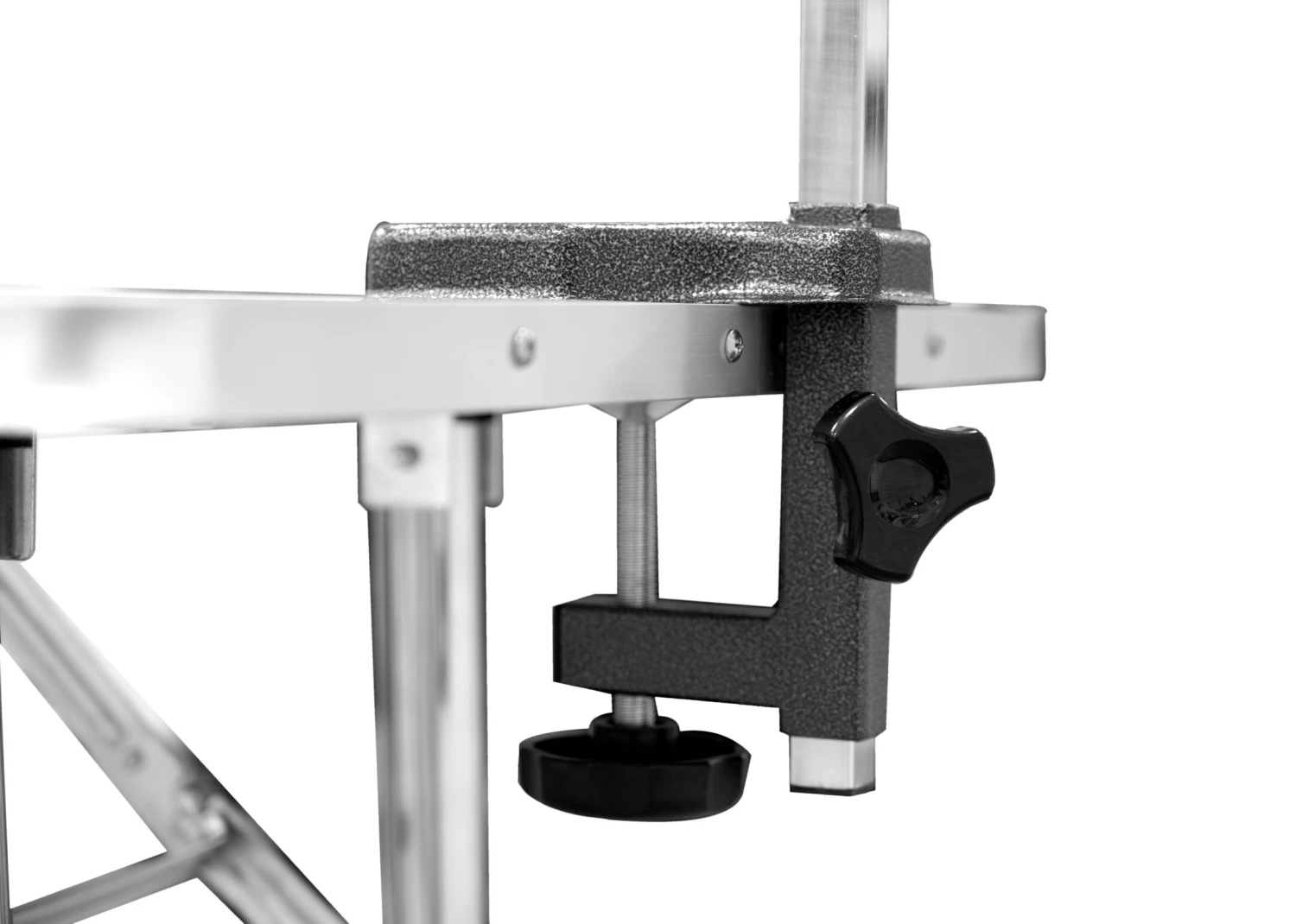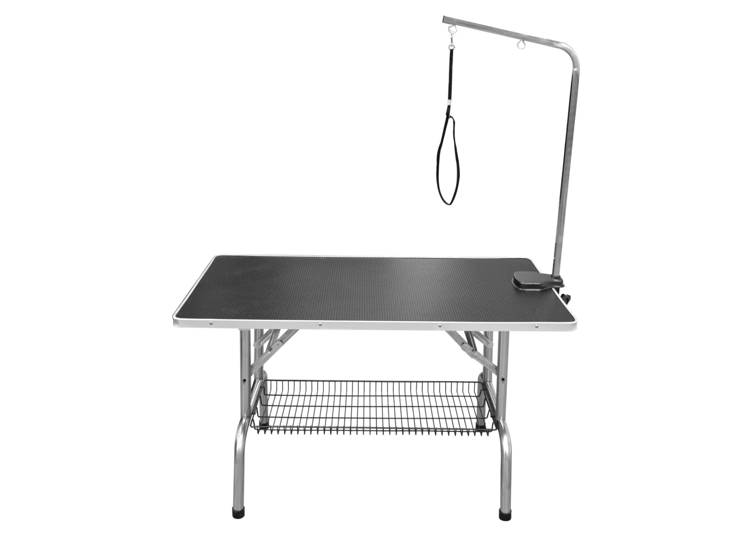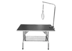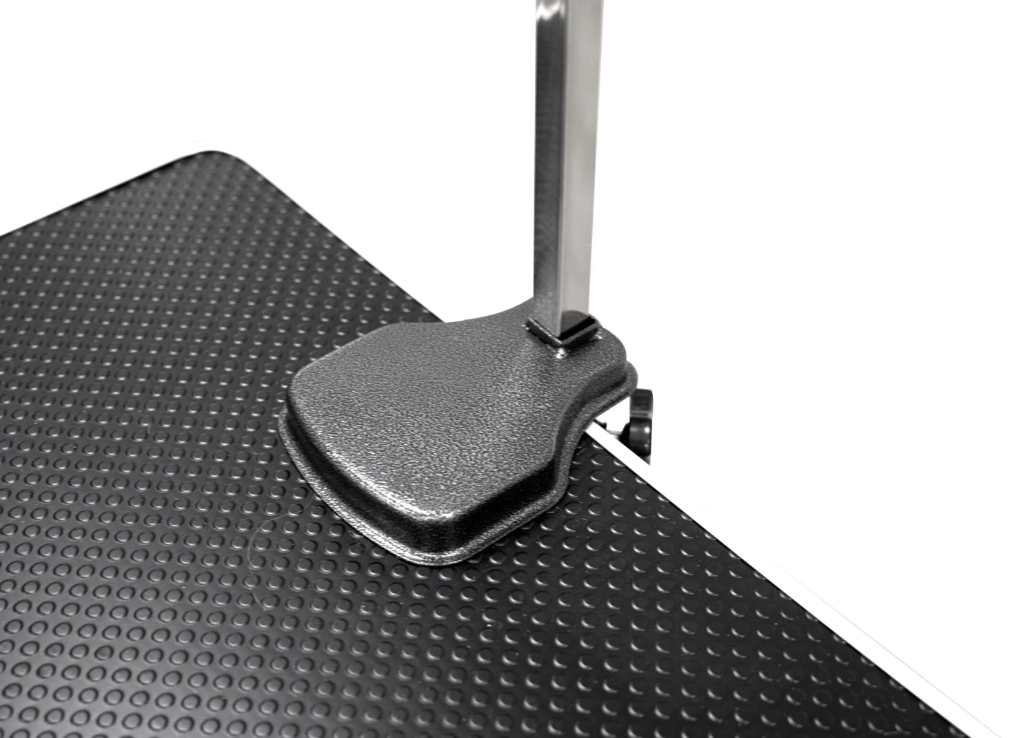 The table edge is finished in an aluminium alloy that is strong and durable, with rounded corners for ease of use and safety. The table is supplied with an adjustable control post (2 attachments rings) and table noose so you can safely attach your dog while grooming and he or she will feel comfortable and secure. The powder coated, oversize clamp allows you to fix the stainless-steel control post anywhere on the table so it can be adjusted for the perfect grooming height and position.